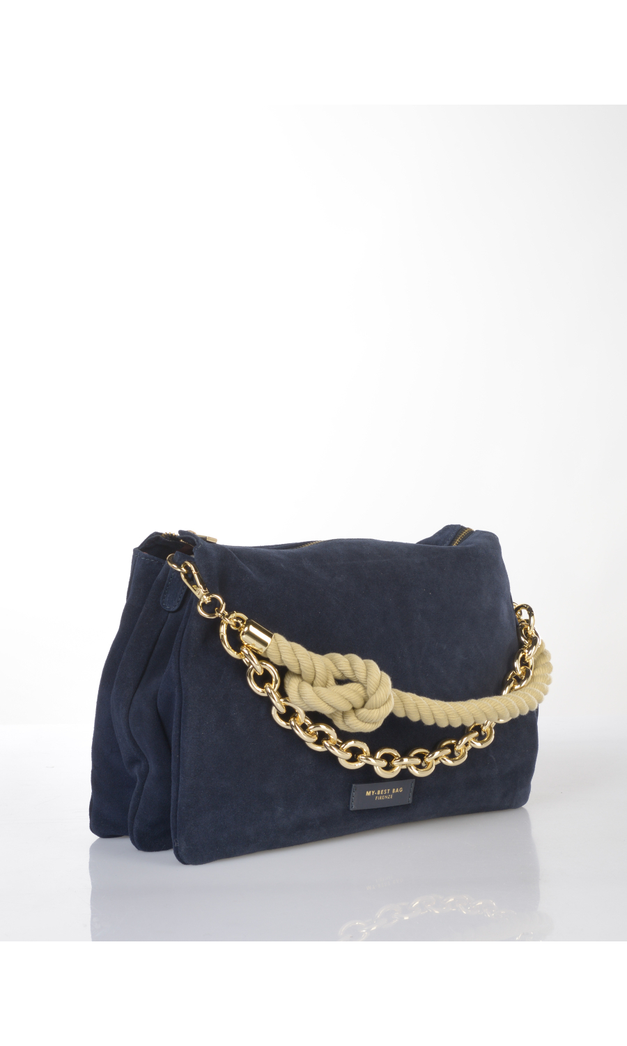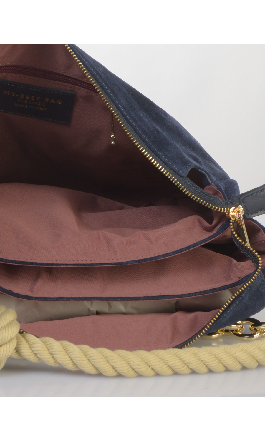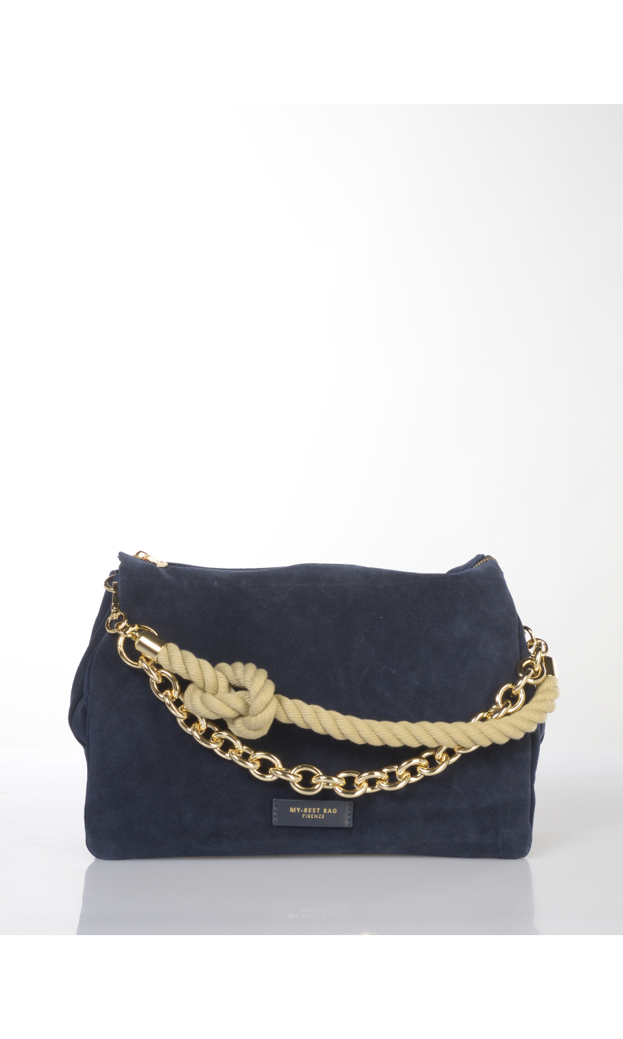 Borsa a mano in vera pelle effetto camoscio con manico a corda a contrasto colore con catenella in metallo dorato completamente rimovibile, tracolla regolabile in pelle spalmata completamente rimovibile, logo applicato frontale, chiusura con zip a vista, tre scomparti, foderata con fodera a contrasto colore.