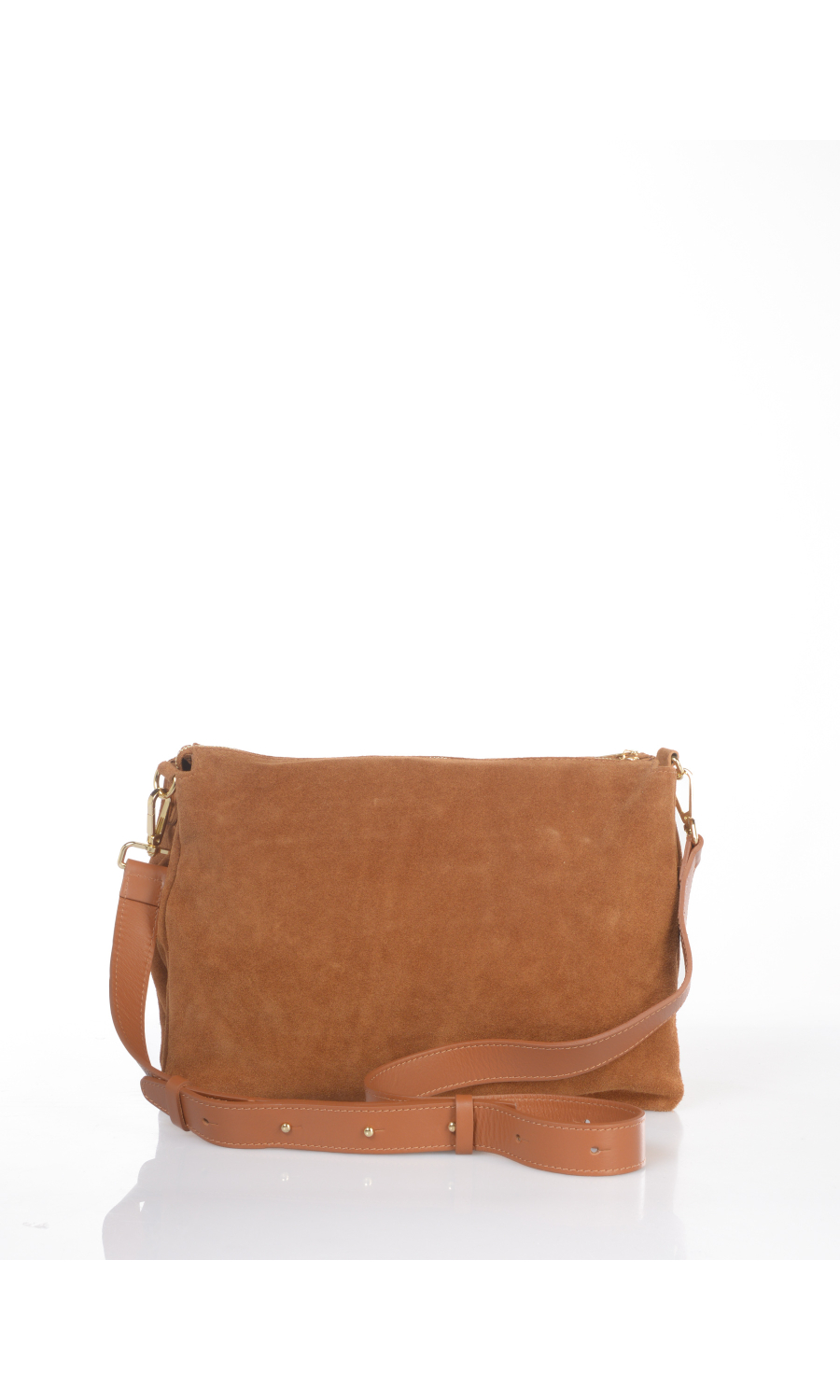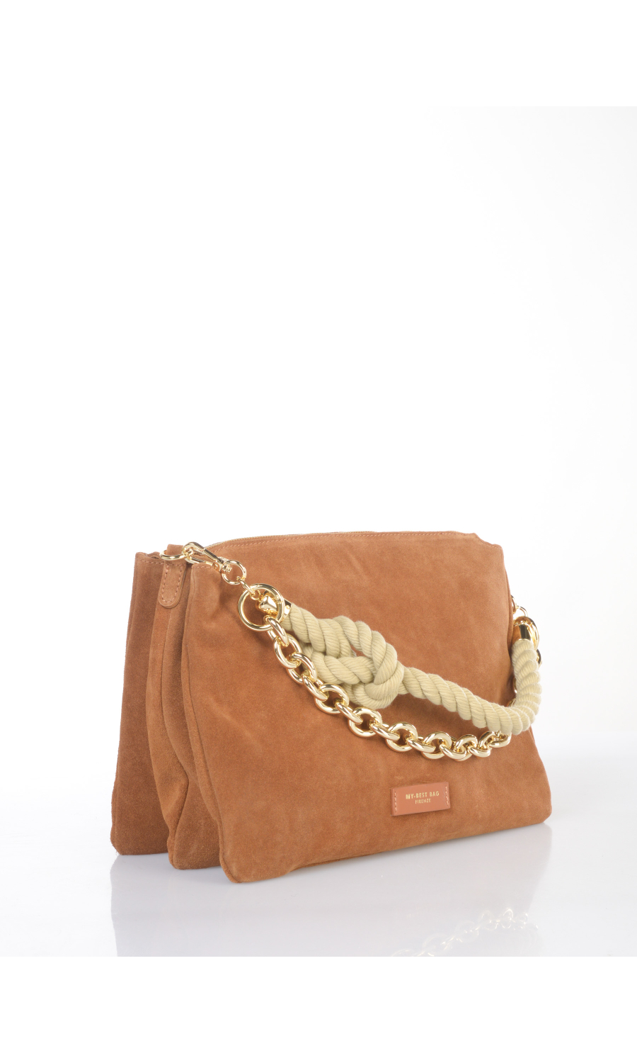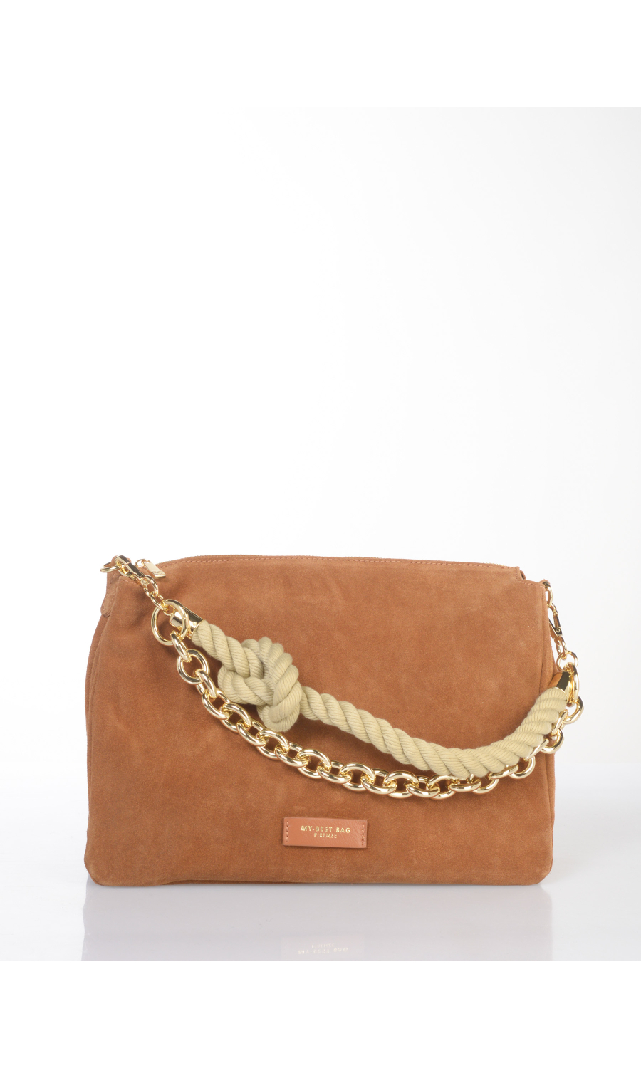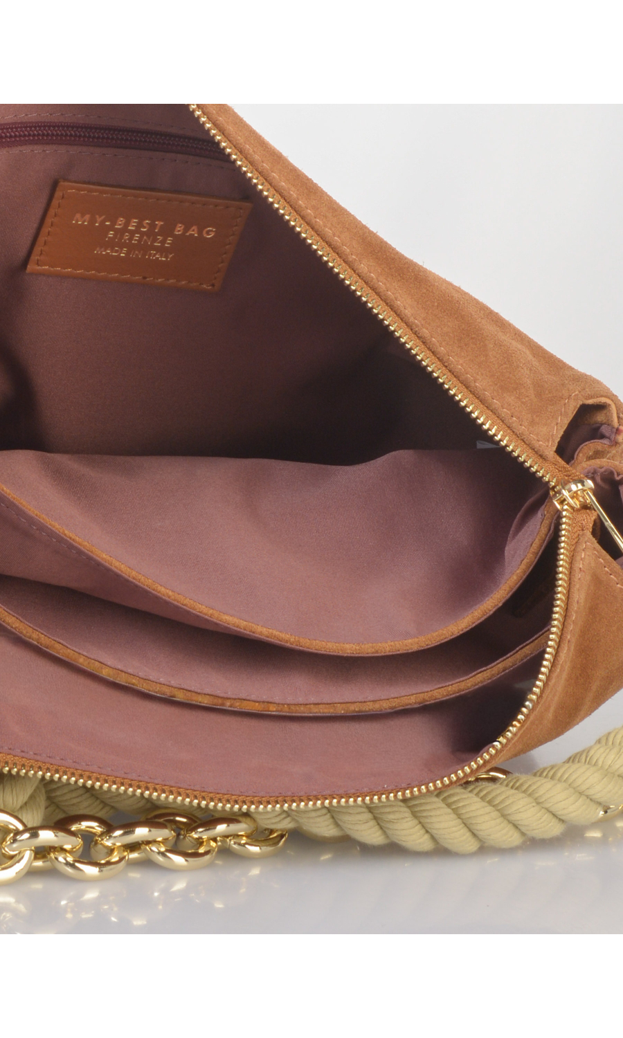 Borsa a mano in vera pelle effetto camoscio con manico a corda a contrasto colore con catenella in metallo dorato completamente rimovibile, tracolla regolabile in pelle spalmata completamente rimovibile, logo applicato frontale, chiusura con zip a vista, tre scomparti, foderata con fodera a contrasto colore.