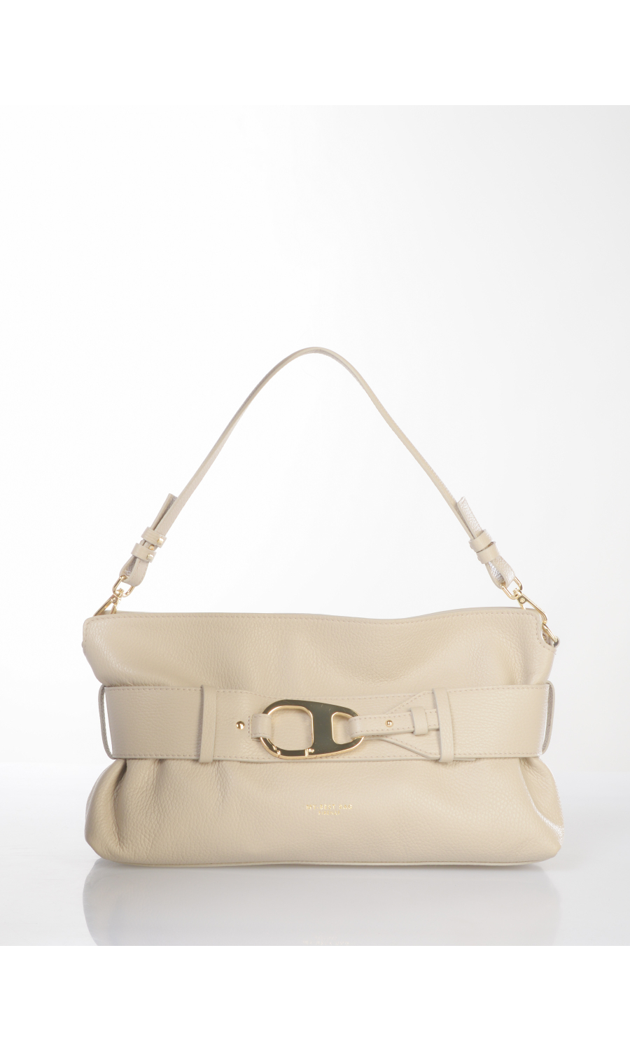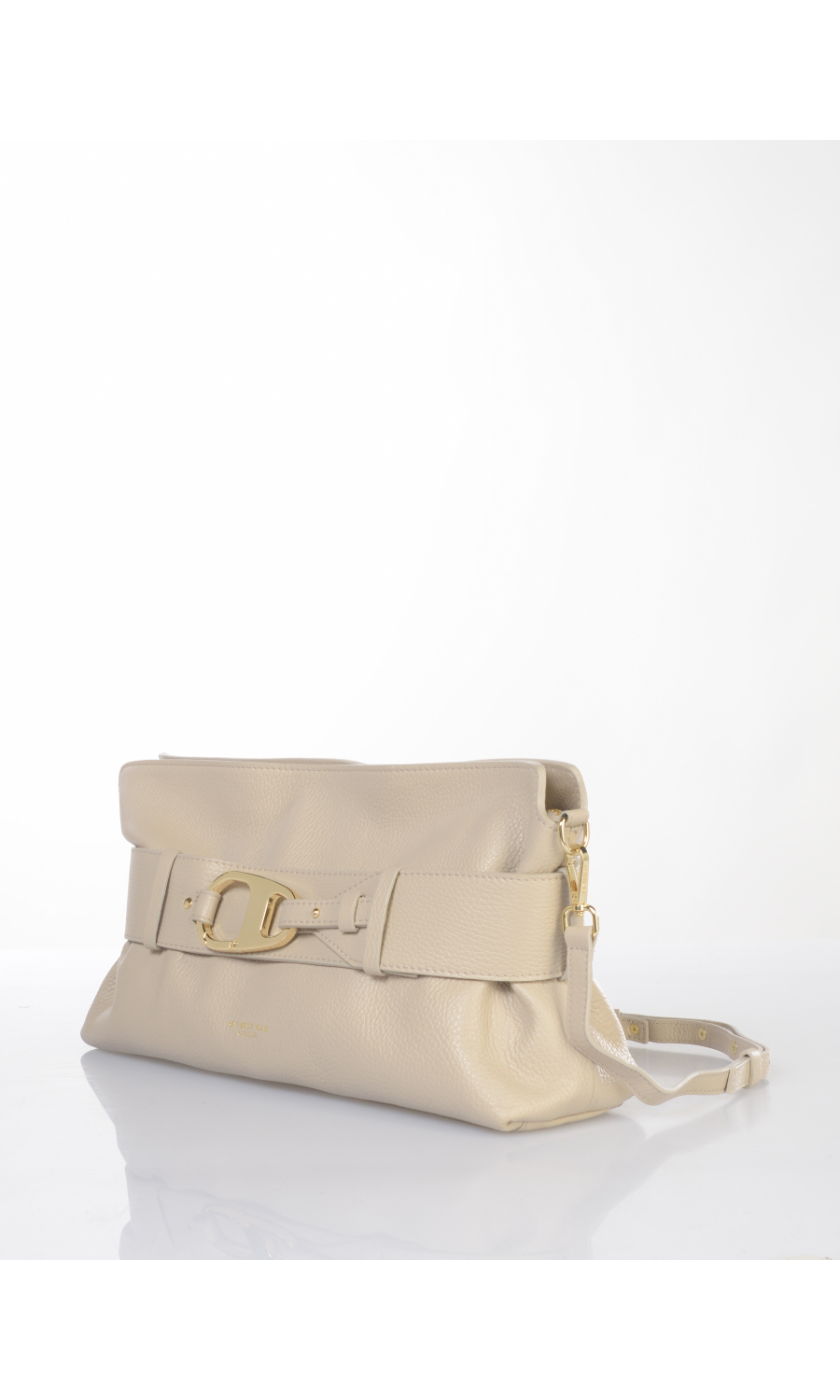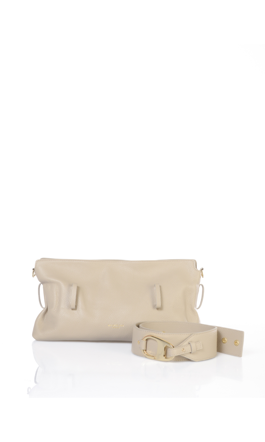 Borsa a mano in vera pelle effetto martellato con cintura applicata chiusa con moschettone logato in metallo dorato e completamente rimovibile, tracolla regolabile e manico completamente rimovibili, logo serigrafato frontale a contrasto colore, chiusura con zip nascosta in metallo dorato e cursore logato, uno scomparto, una tasca di servizio interna chiusa con zip, foderata con fodera in tessuto a contrasto colore.