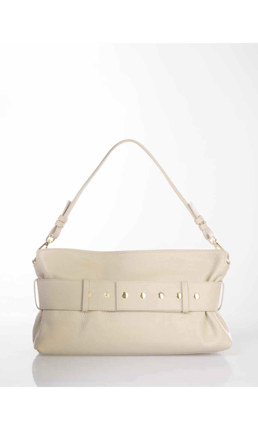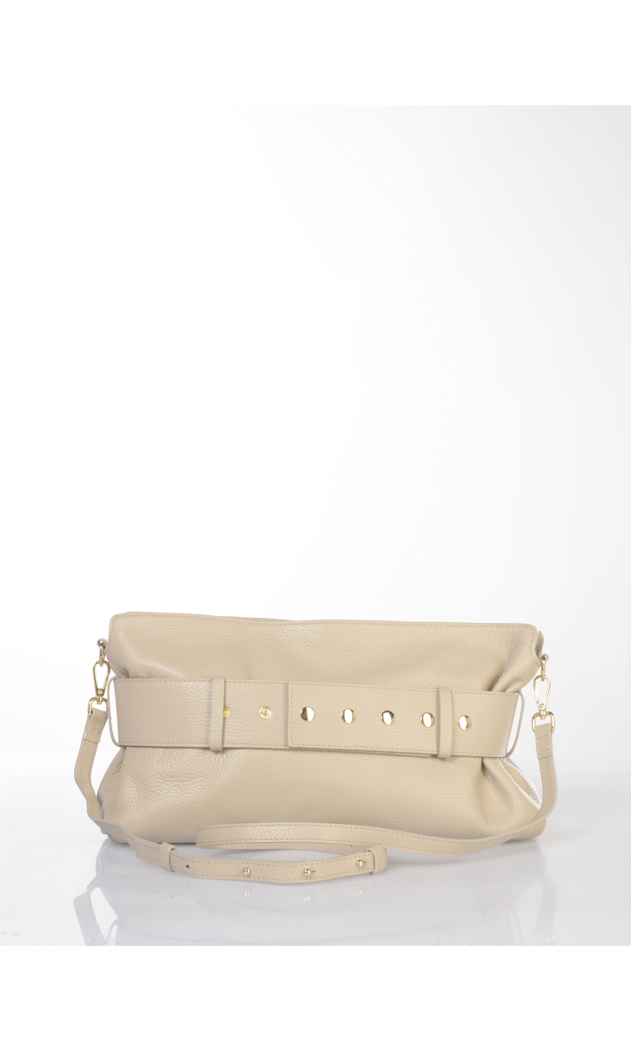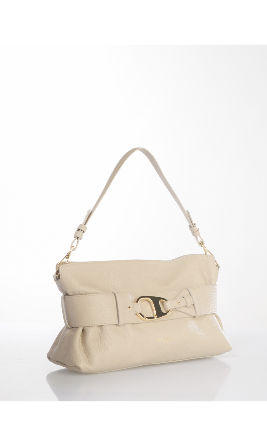 Borsa a mano in vera pelle effetto martellato con cintura applicata chiusa con moschettone logato in metallo dorato e completamente rimovibile, tracolla regolabile e manico completamente rimovibili, logo serigrafato frontale a contrasto colore, chiusura con zip nascosta in metallo dorato e cursore logato, uno scomparto, una tasca di servizio interna chiusa con zip, foderata con fodera in tessuto a contrasto colore.