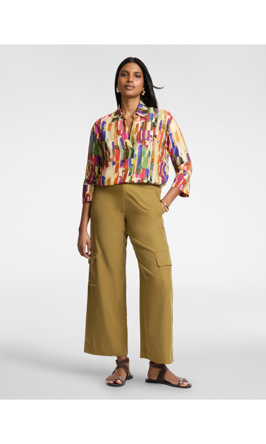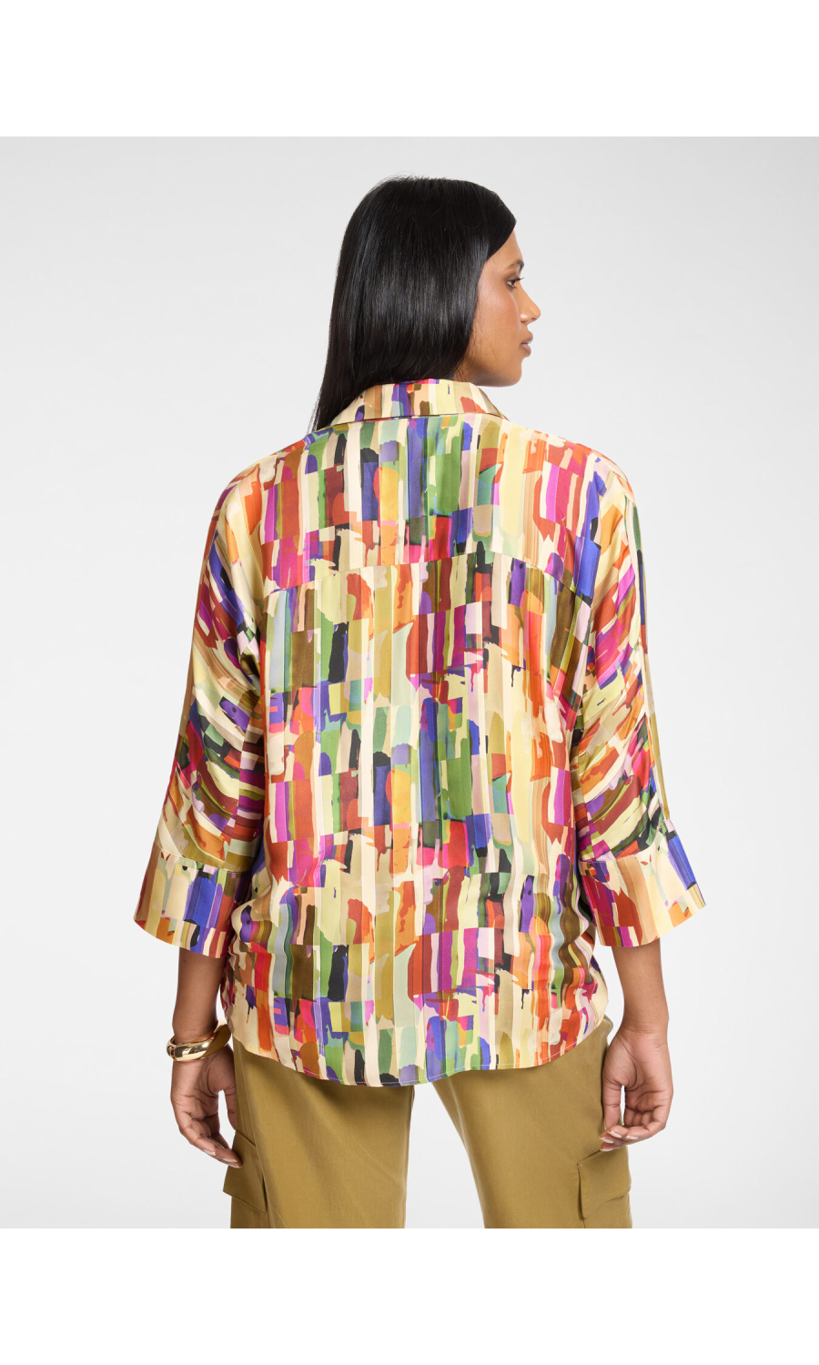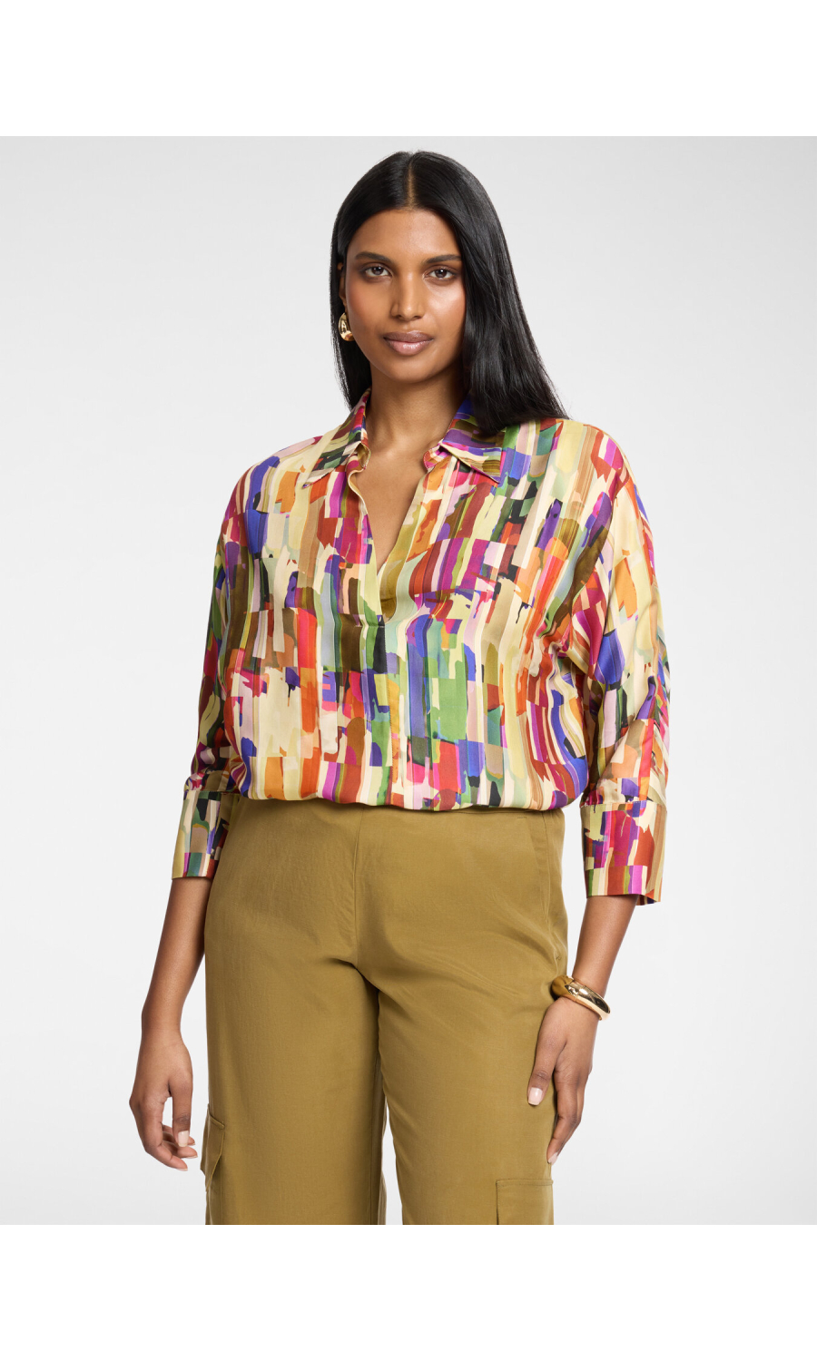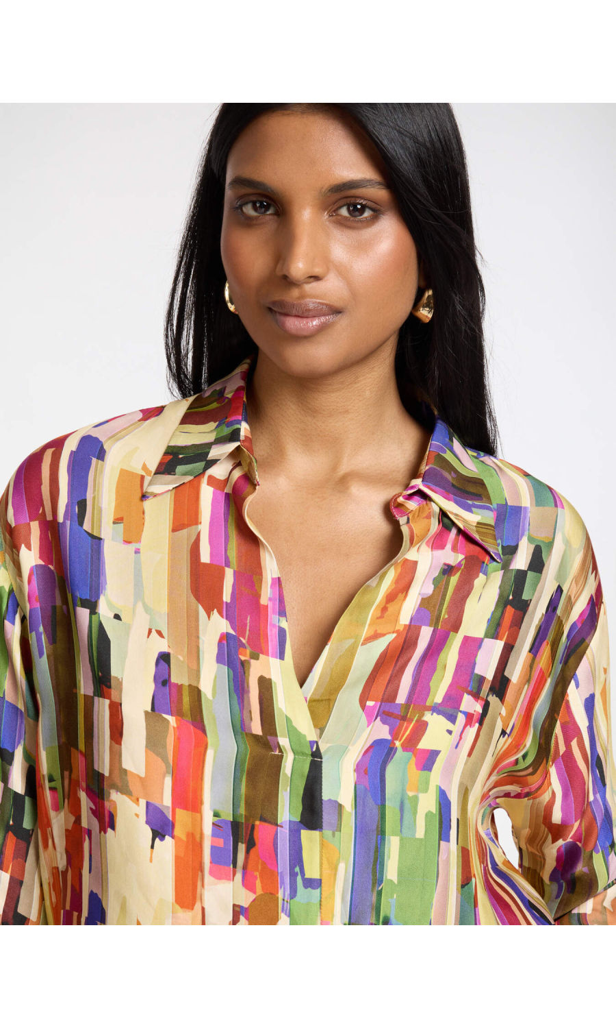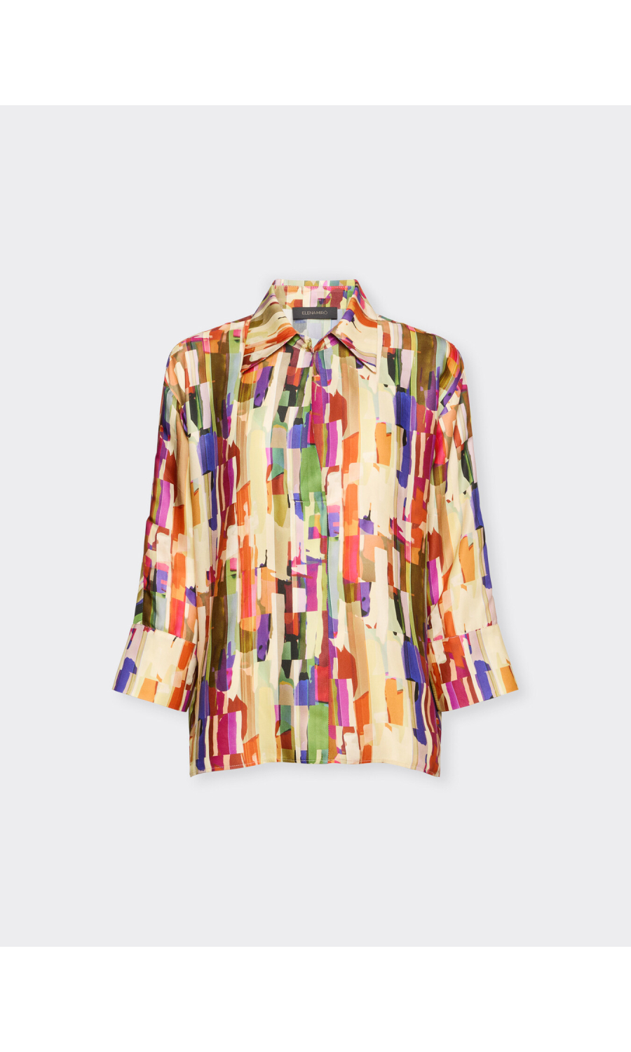 Camicia in twill di viscosa con stampa multicolor all-over. Vestibilita' boxy senza chiusure, con maniche tre quarti e colletto classico. Versatile e raffinata, perfetta con pantaloni sartoriali o jeans.
