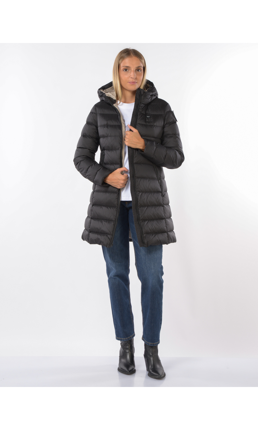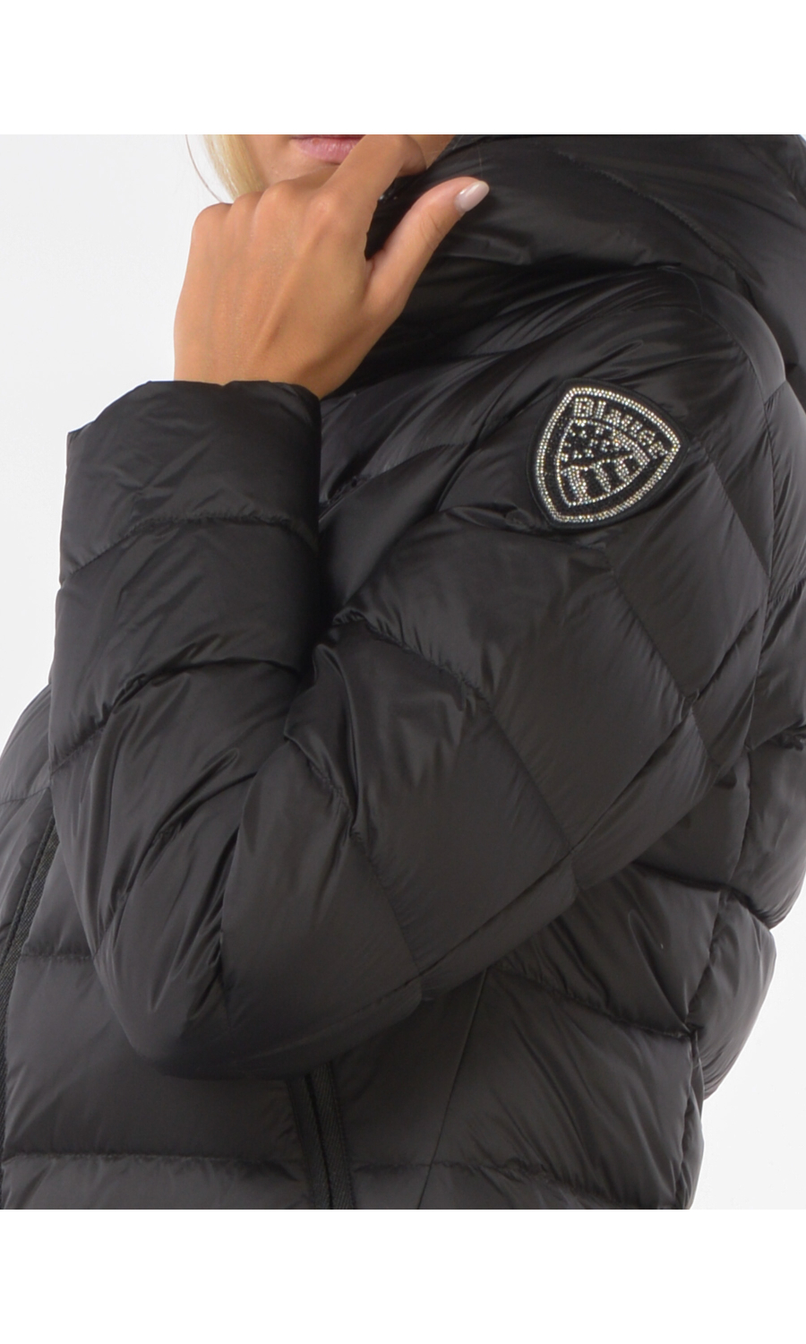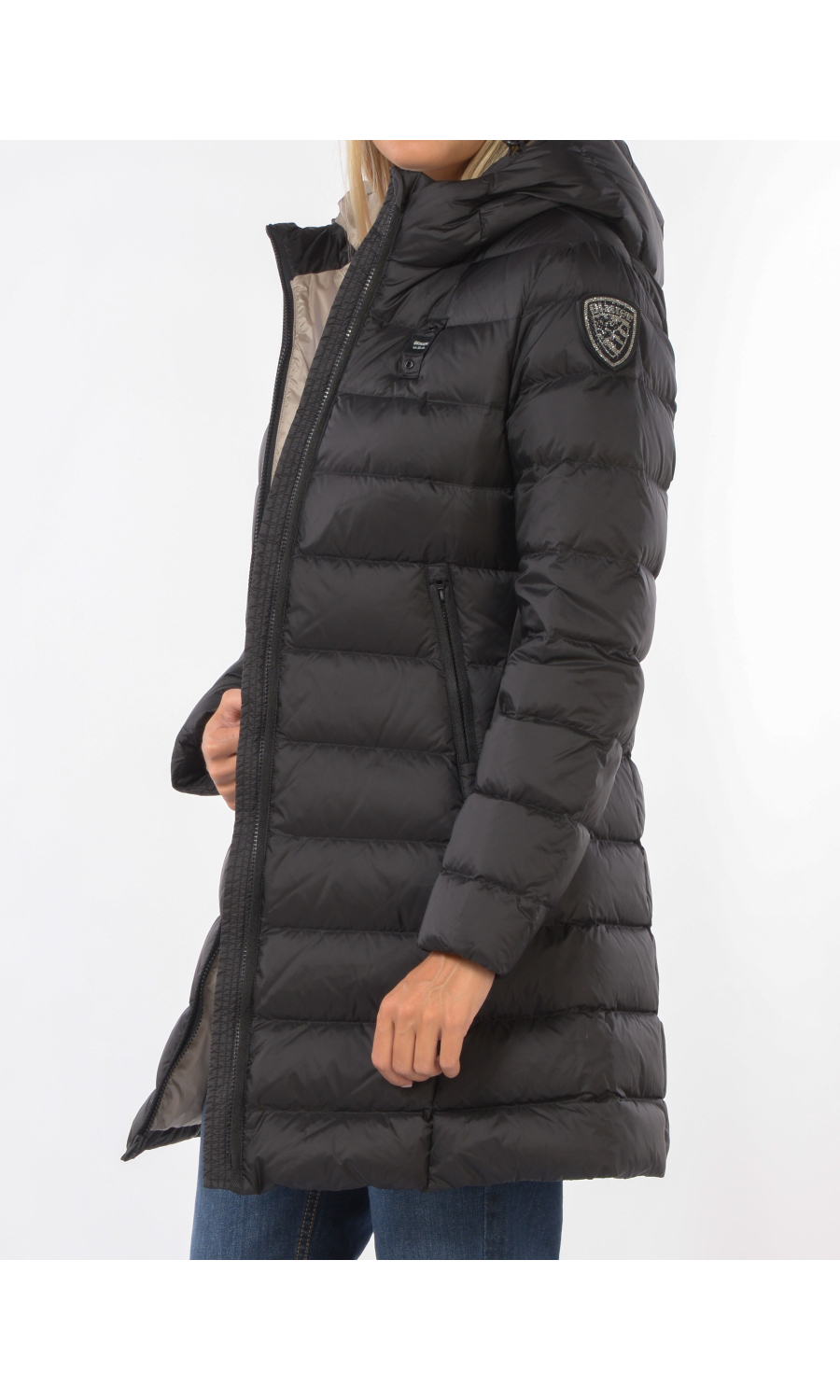 Giaccone modello Agnes con cappuccio fisso e coulisse regolabile a vista, chiusura frontale con zip nascosta e cursore logato a doppia via a vista, manica lunga, due tasche oblique frontali chiuse con zip nascosta, logo applicato frontale e sul lato della manica sinistra con strass ma completamente rimovibile, imbottito in piuma con effetto trapuntato, due tasche interne di cui una chiusa con zip e una con velcro, fodera a contrasto colore.