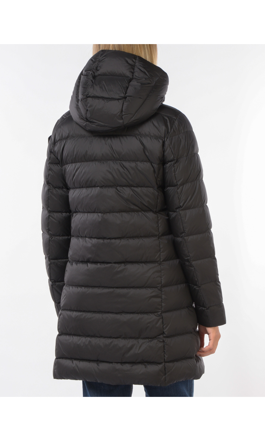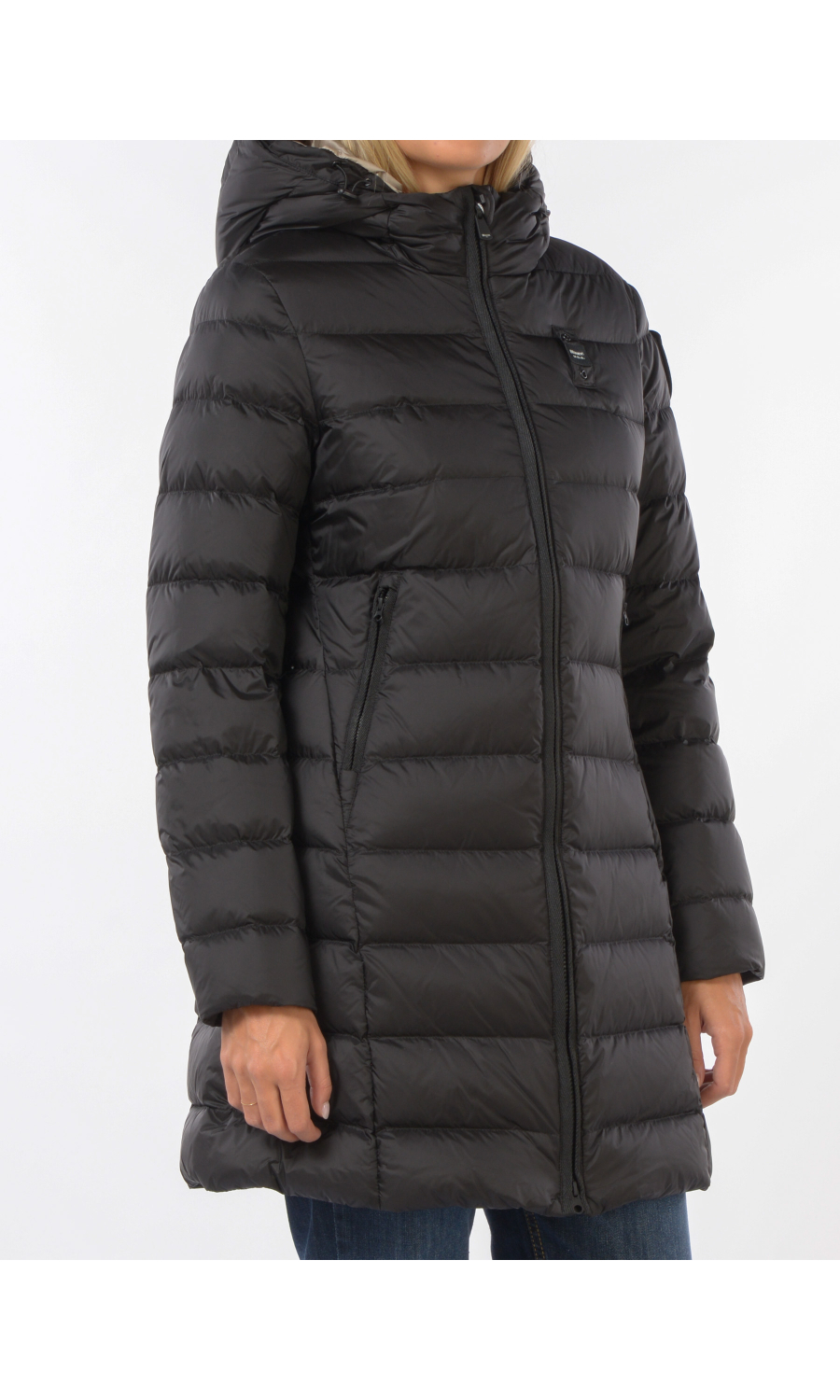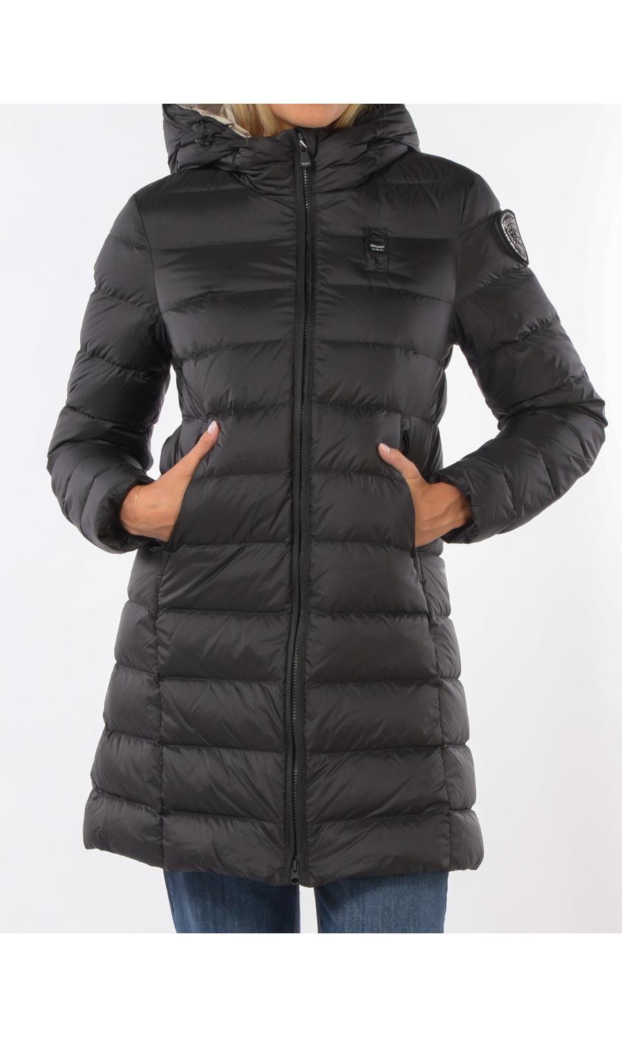 Giaccone modello Agnes con cappuccio fisso e coulisse regolabile a vista, chiusura frontale con zip nascosta e cursore logato a doppia via a vista, manica lunga, due tasche oblique frontali chiuse con zip nascosta, logo applicato frontale e sul lato della manica sinistra con strass ma completamente rimovibile, imbottito in piuma con effetto trapuntato, due tasche interne di cui una chiusa con zip e una con velcro, fodera a contrasto colore.