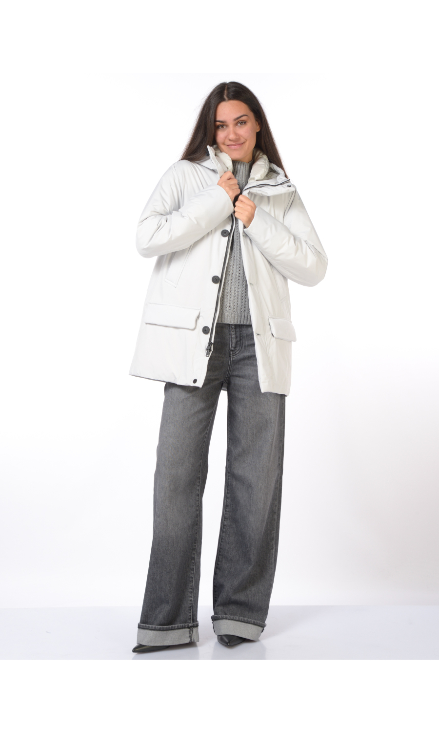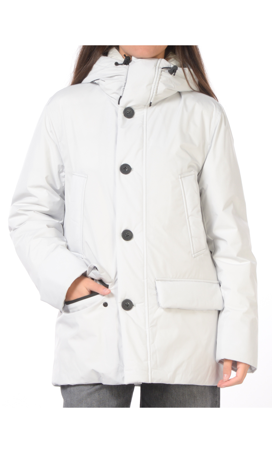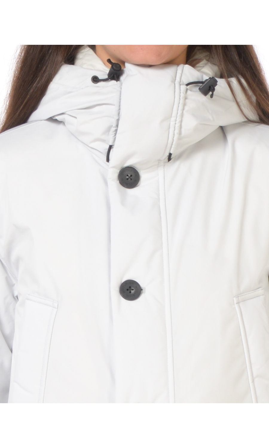 Giaccone modello Cloud Arctic Parka con cappuccio fisso regolabile con coulisse logata, chiusura frontale con zip nascosta, bottoni logati a vista e a pressione nascosti, manica lunga con polsini in jersey su interno manica, due tasche oblique frontali chiuse con bottoni a pressione nascosti e due a pattina chiuse con bottoni a pressione nascosti e zip, coulisse regolabile in vita nella parte interna, imbottito in piuma d'anatra, in tessuto resistente all'acqua, al vento e traspirante.