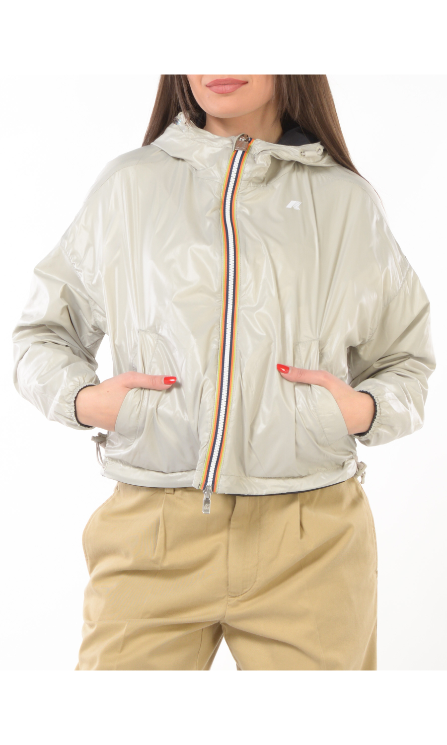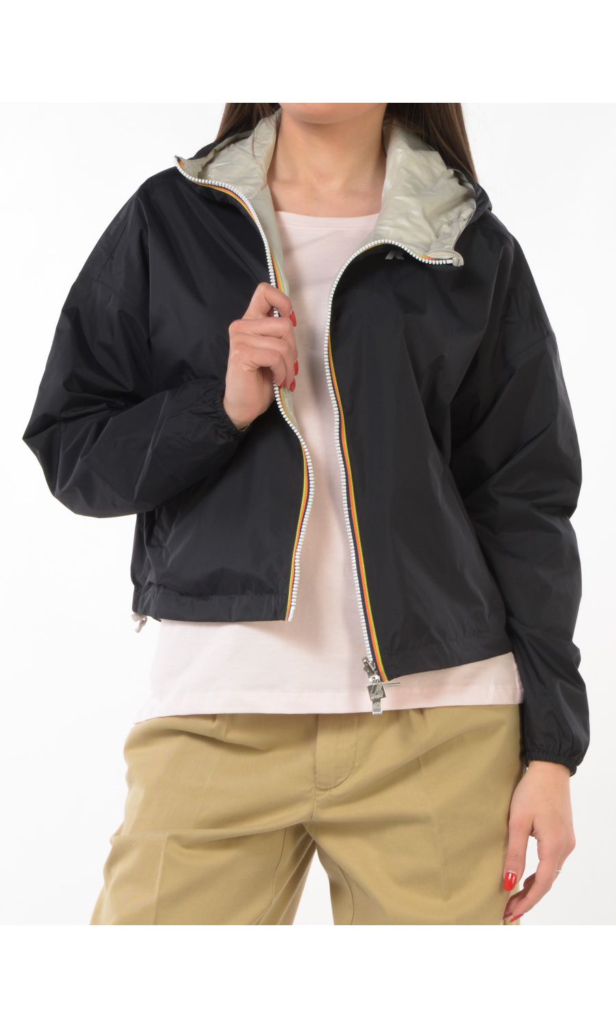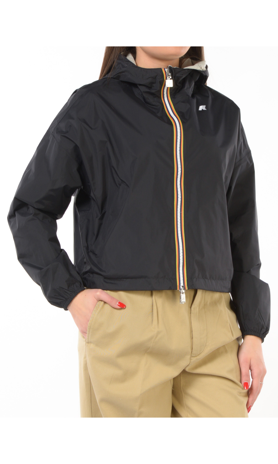 Giubbino modello Laurette Plus 2.0 reversibile a contrasto colore, chiusura frontale con zip termonastrata e cursore logato a doppia via, cappuccio fisso con coulisse regolabile, manica lunga con spalla scesa e chiusa con stretto polso con elastico, due tasche oblique frontali chiuse con zip da un lato e con bottone a pressione nascosto dall'altro lato, logo stampato frontale a contrasto colore, coulisse regolabile sul fondo, modello cropped, impermeabile, antivento, traspirante.