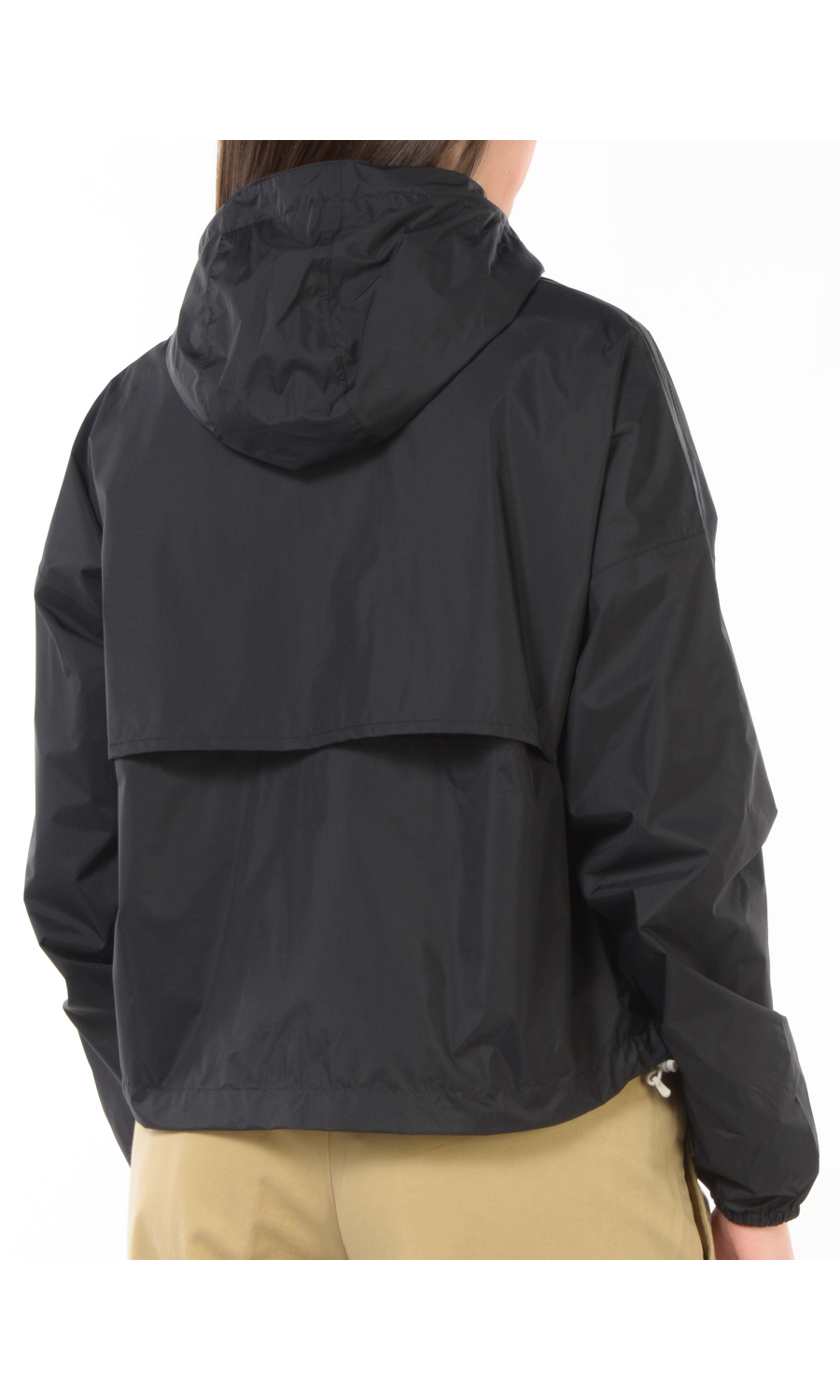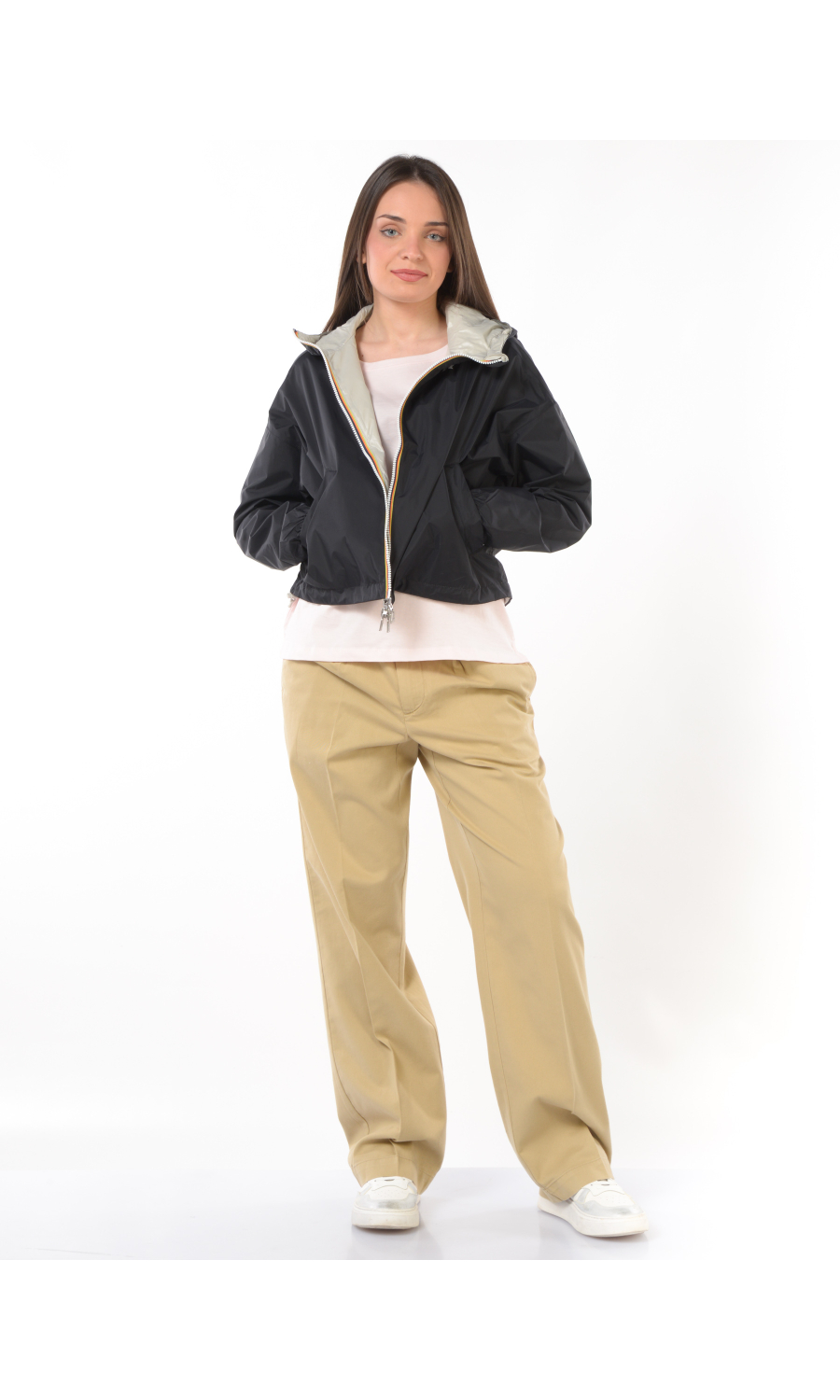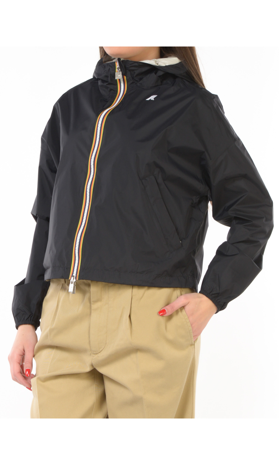 Giubbino modello Laurette Plus 2.0 reversibile a contrasto colore, chiusura frontale con zip termonastrata e cursore logato a doppia via, cappuccio fisso con coulisse regolabile, manica lunga con spalla scesa e chiusa con stretto polso con elastico, due tasche oblique frontali chiuse con zip da un lato e con bottone a pressione nascosto dall'altro lato, logo stampato frontale a contrasto colore, coulisse regolabile sul fondo, modello cropped, impermeabile, antivento, traspirante.