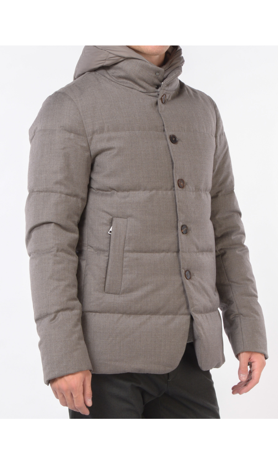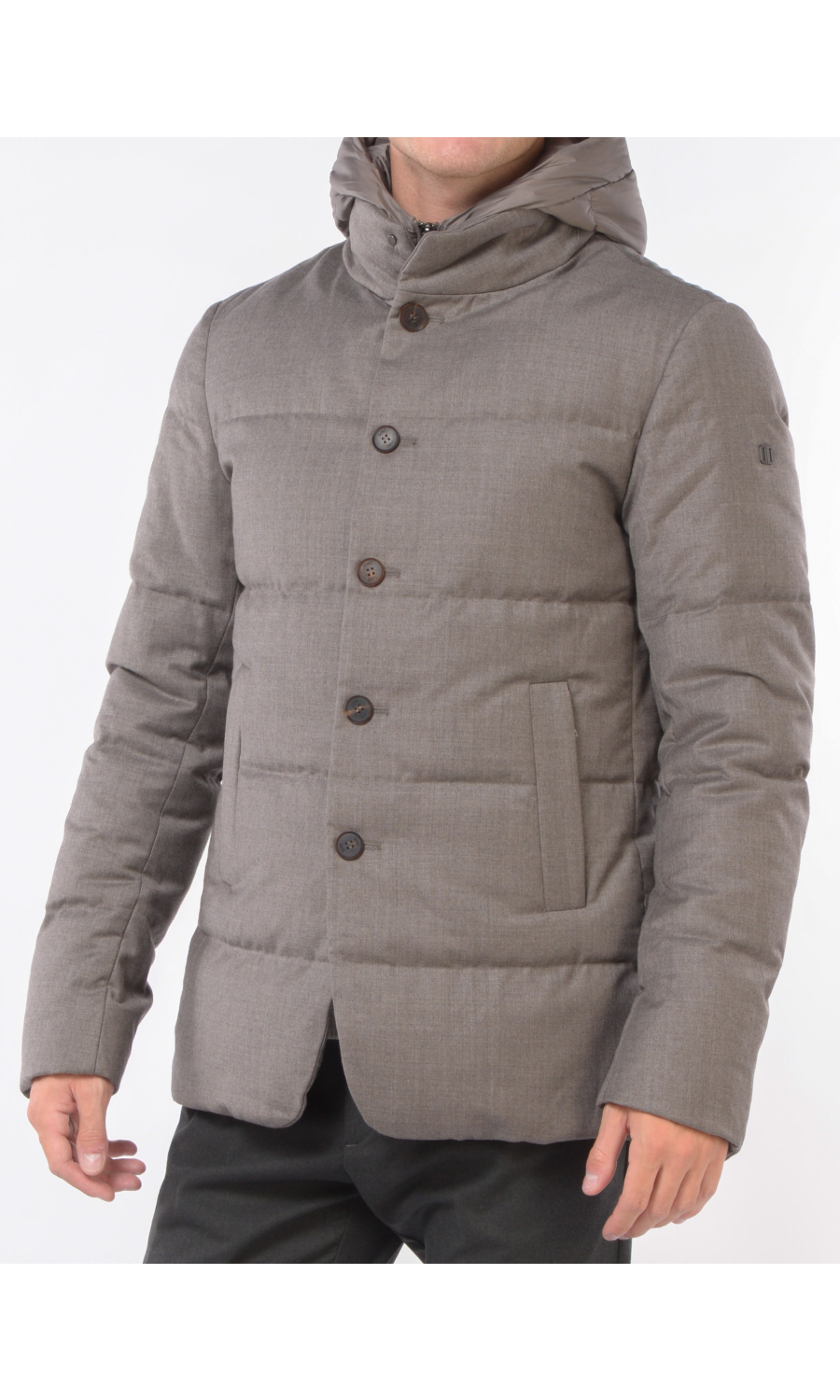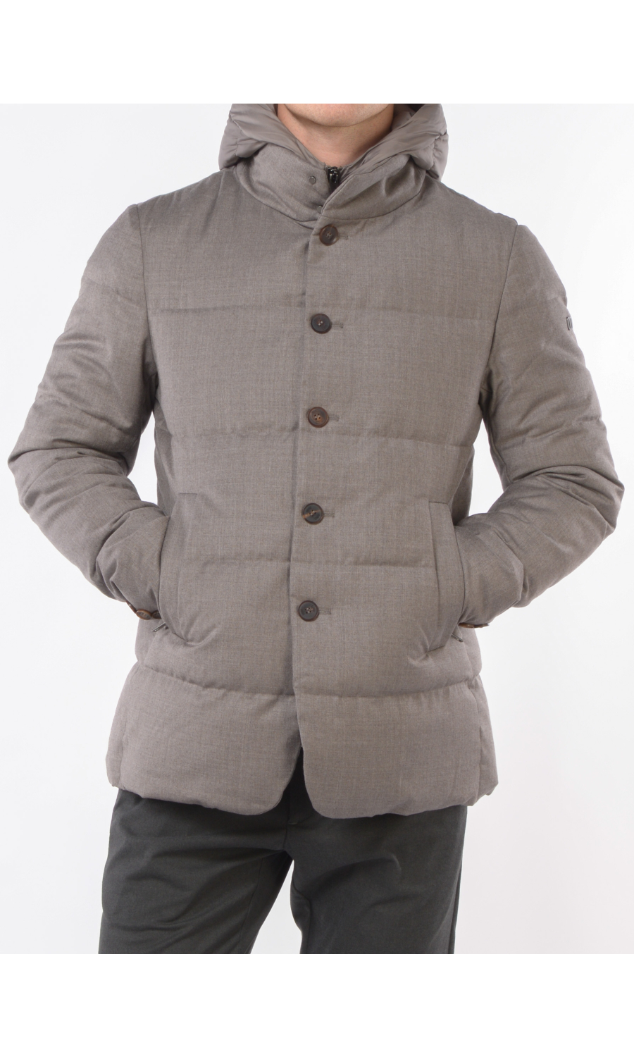 Giubbino in lana imbottito con stacchino scaldacollo e cappuccio rimovibile, chiusura frontale con bottoni a vista e zi p nascosta, due tasche frontali chiuse con zip, logo in metallo applicato su spalla sinistra.