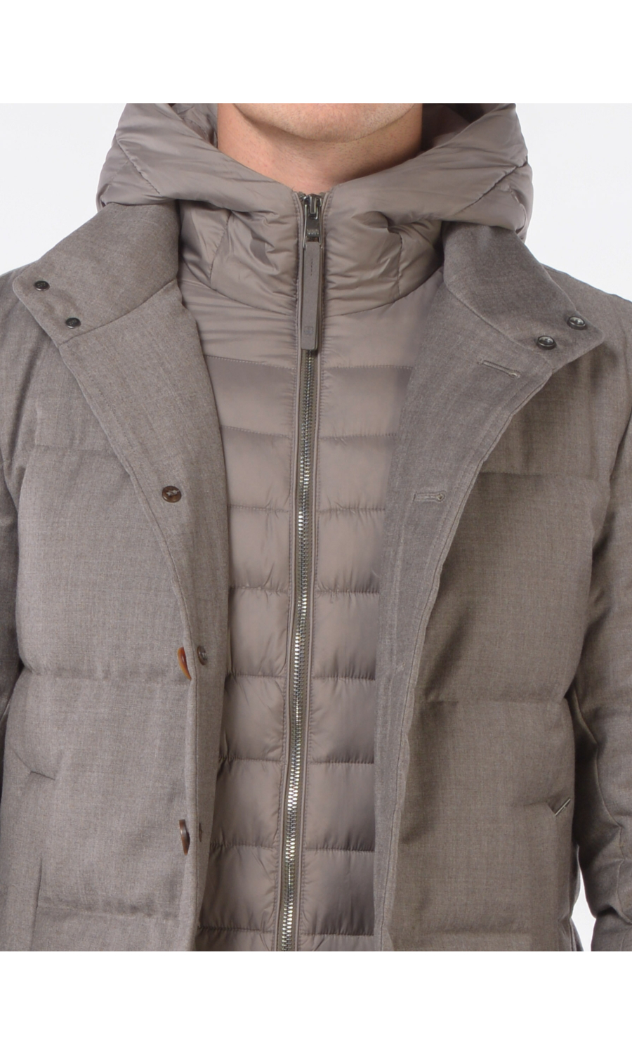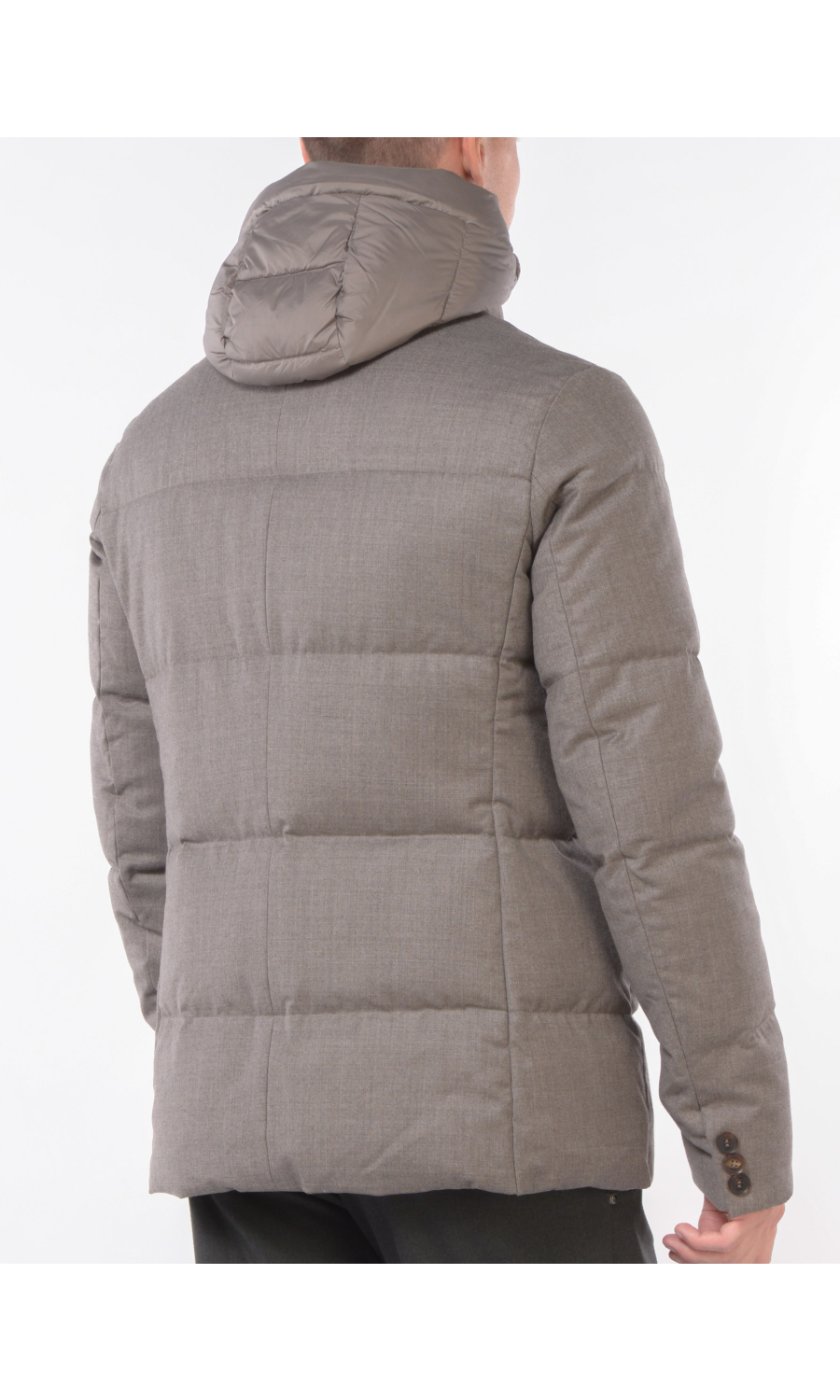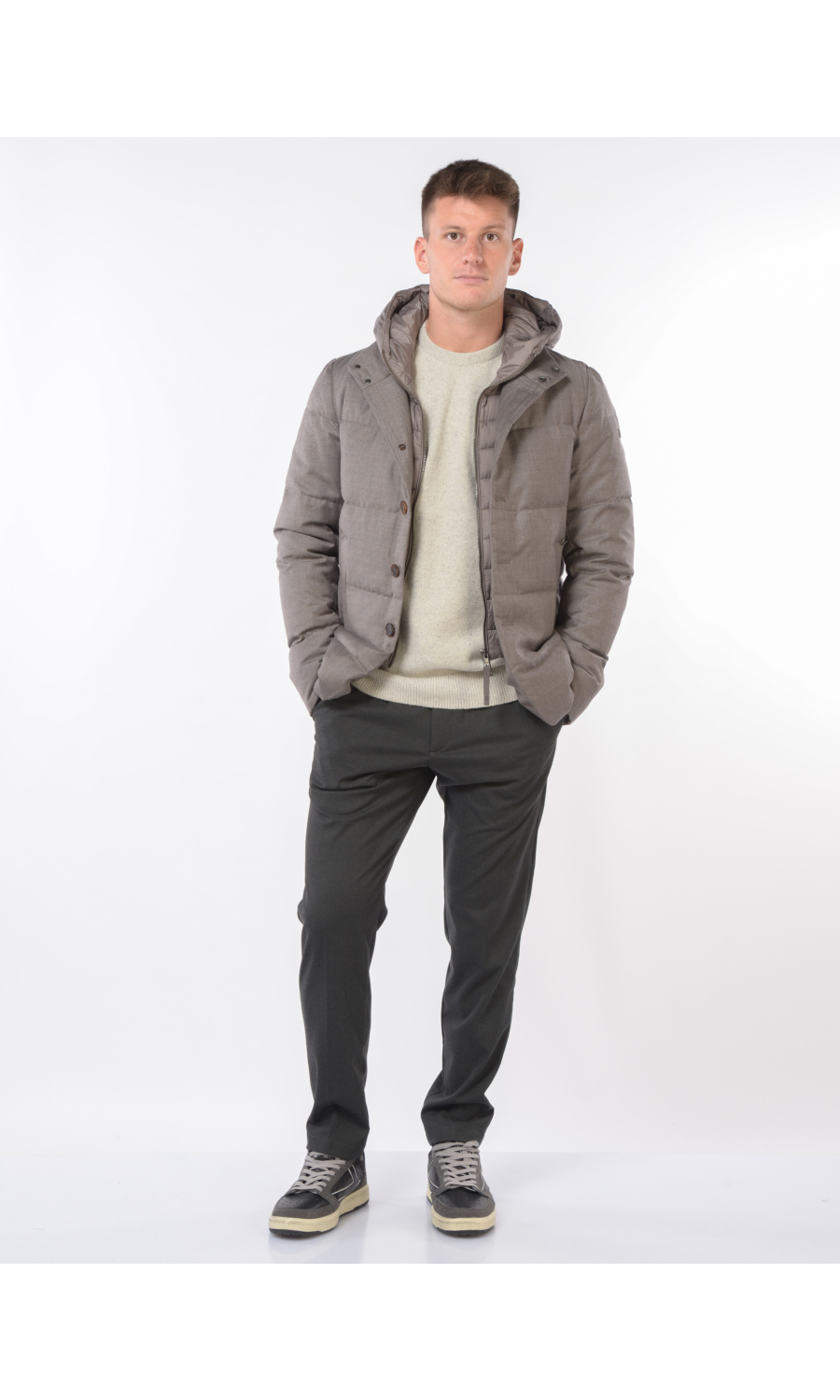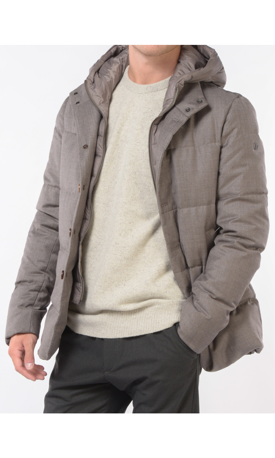 Giubbino in lana imbottito con stacchino scaldacollo e cappuccio rimovibile, chiusura frontale con bottoni a vista e zi p nascosta, due tasche frontali chiuse con zip, logo in metallo applicato su spalla sinistra.