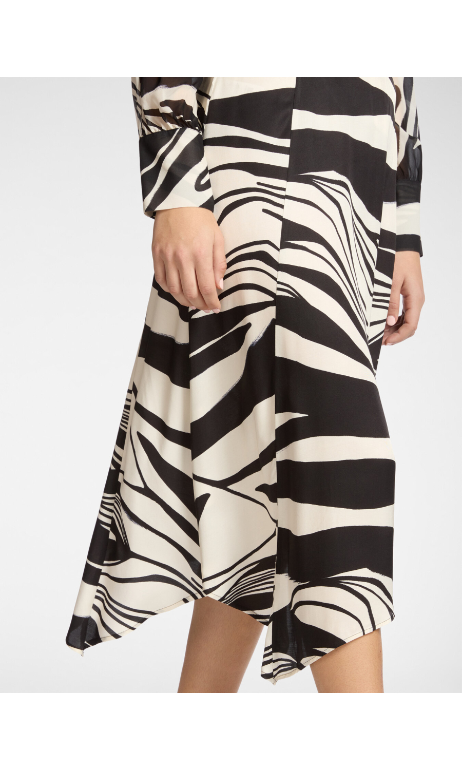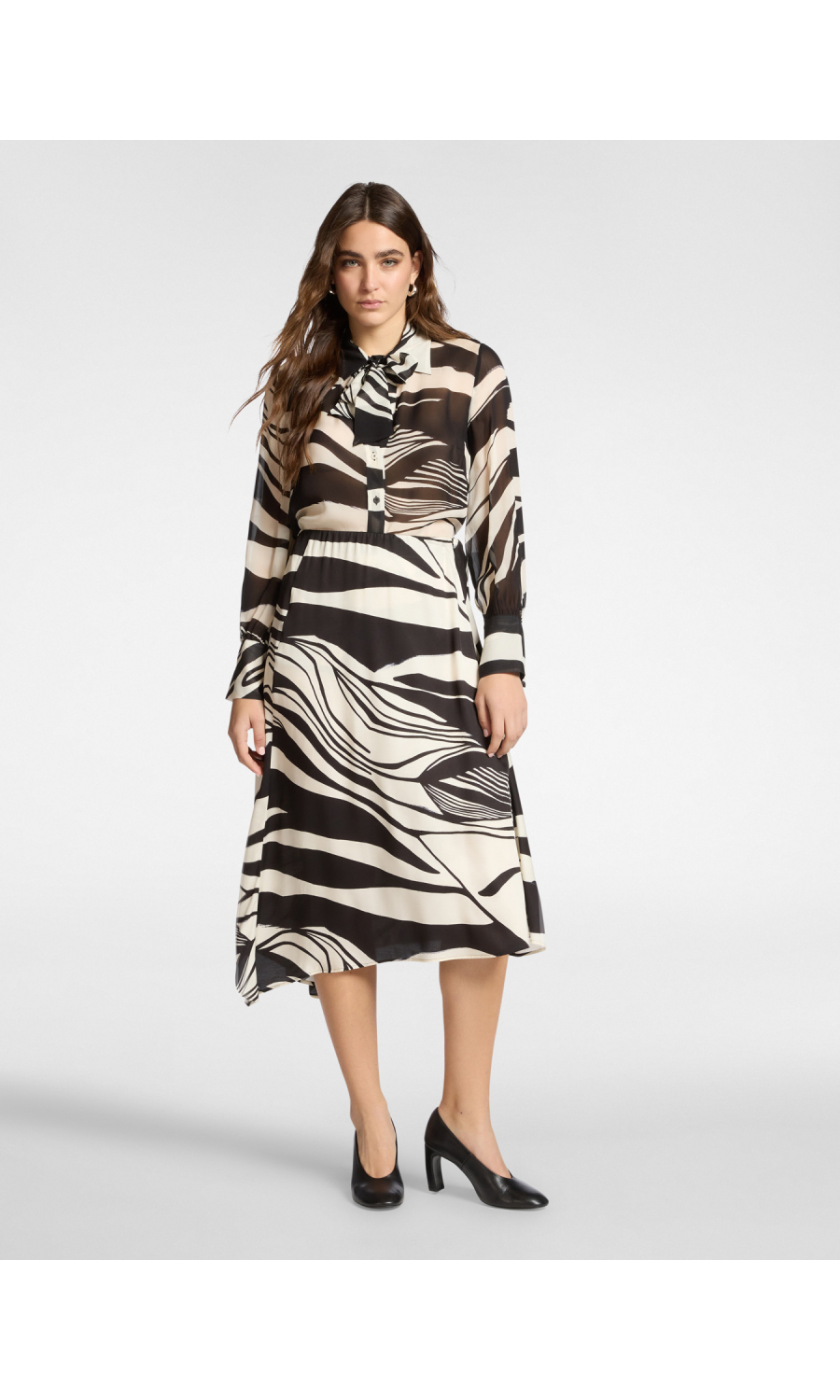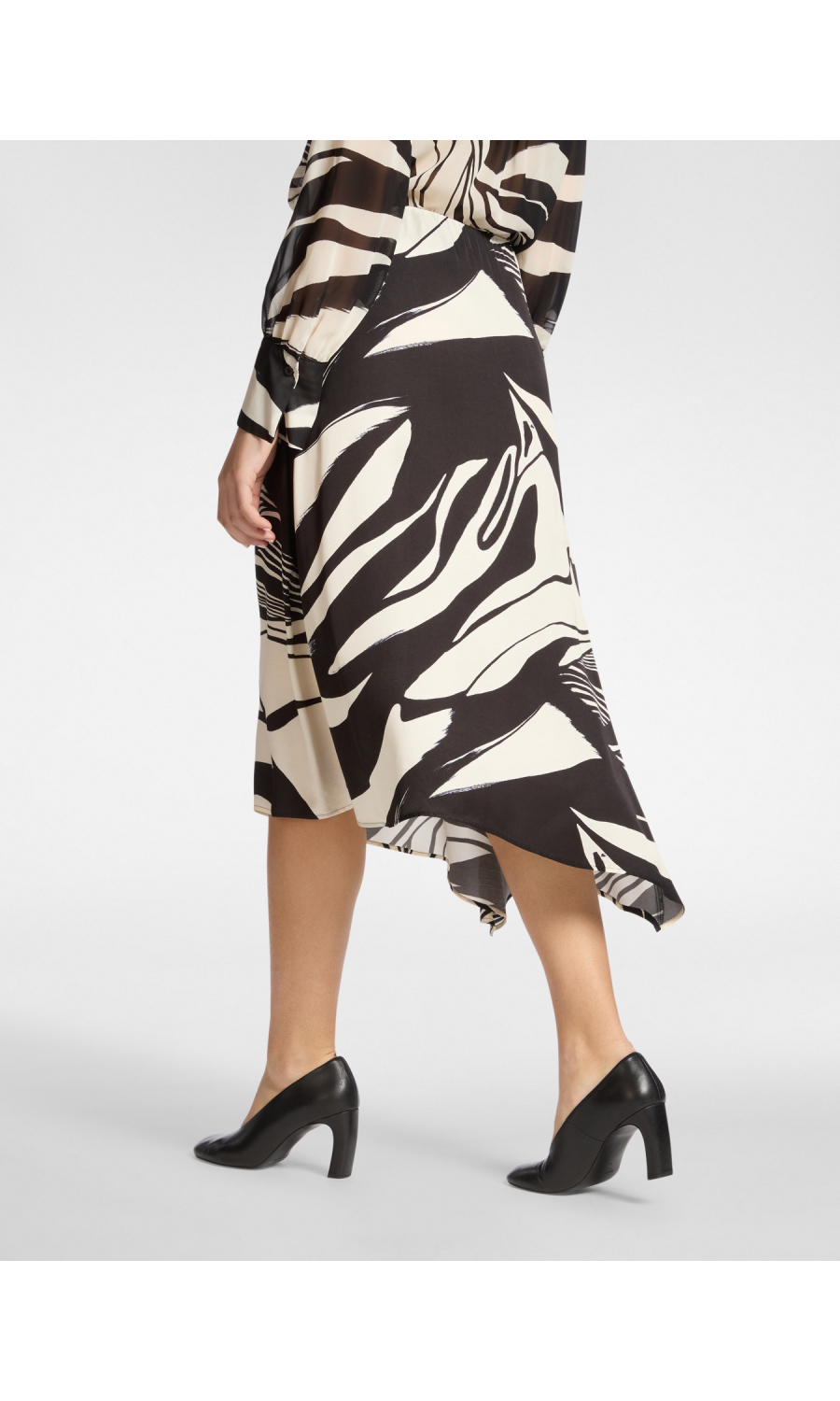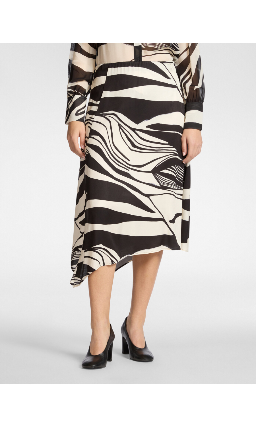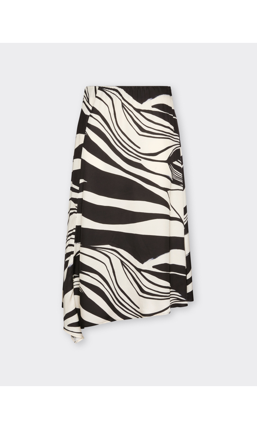 Gonna midi svasata in raso di viscosa con stampa grafica all-over. Il drappeggio laterale dona volume e movimento alla silhouette, mentre la fascia elastica assicura comfort in vita. Versatile ed elegante, perfetta sia con camicia per l’ufficio sia con top coordinato per un look raffinato.