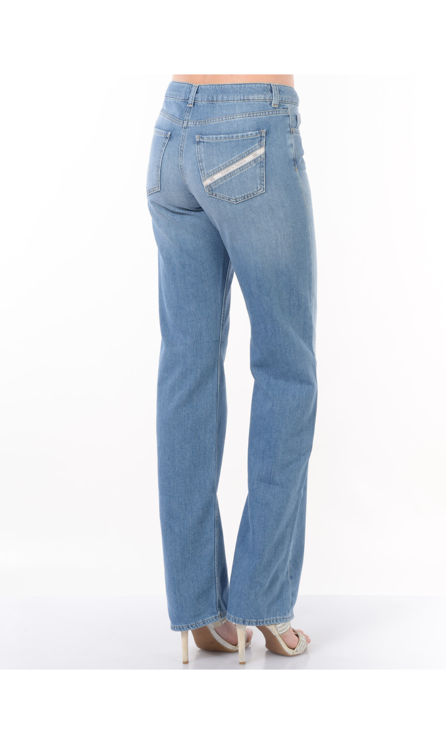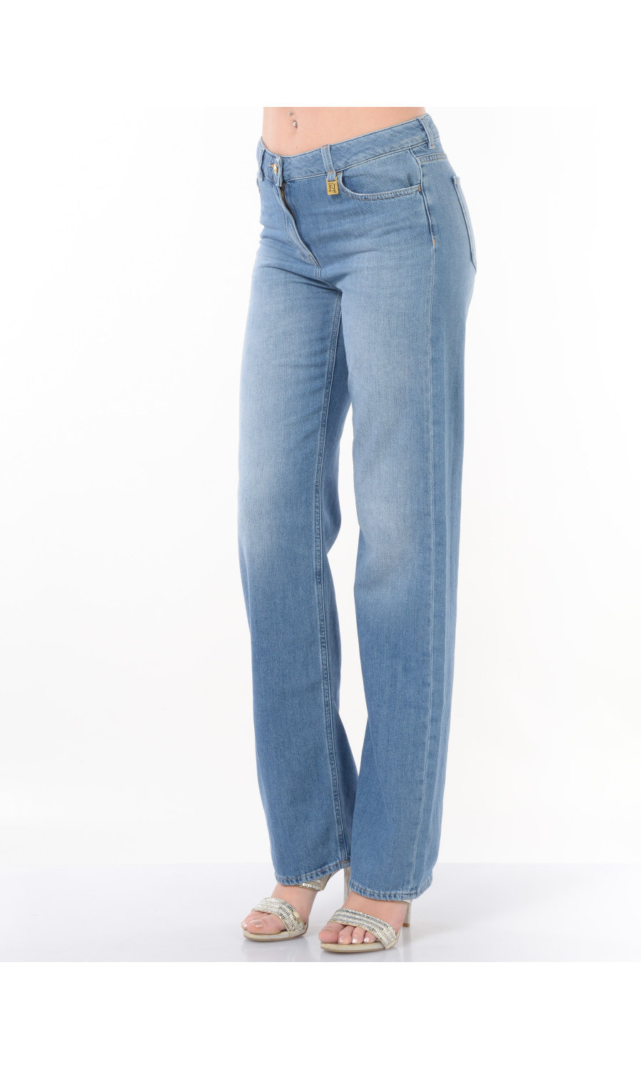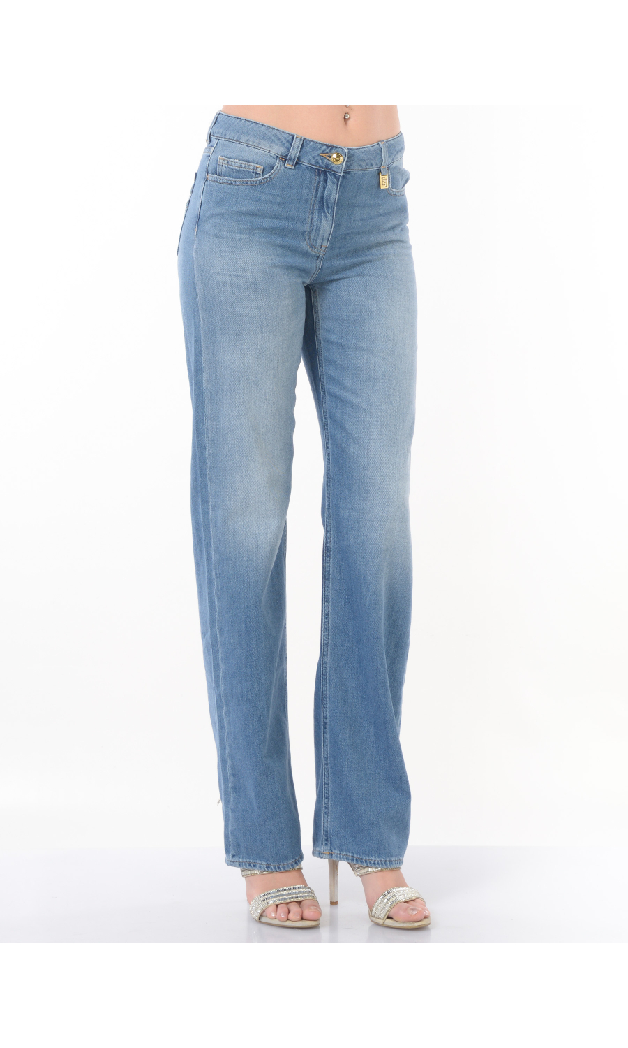 Jeans modello a palazzo con vita bassa, chiusura frontale con bottone logato in galvanica dorata a vista e zip nascosta, fascetta in vita con passanti, cinque tasche, motivo di impunture a contrasto colore, logo inserito su tasca posteriore a contrasto colore, placchetta logo in galvanica dorata applicato frontale, leggero effetto stone washed.