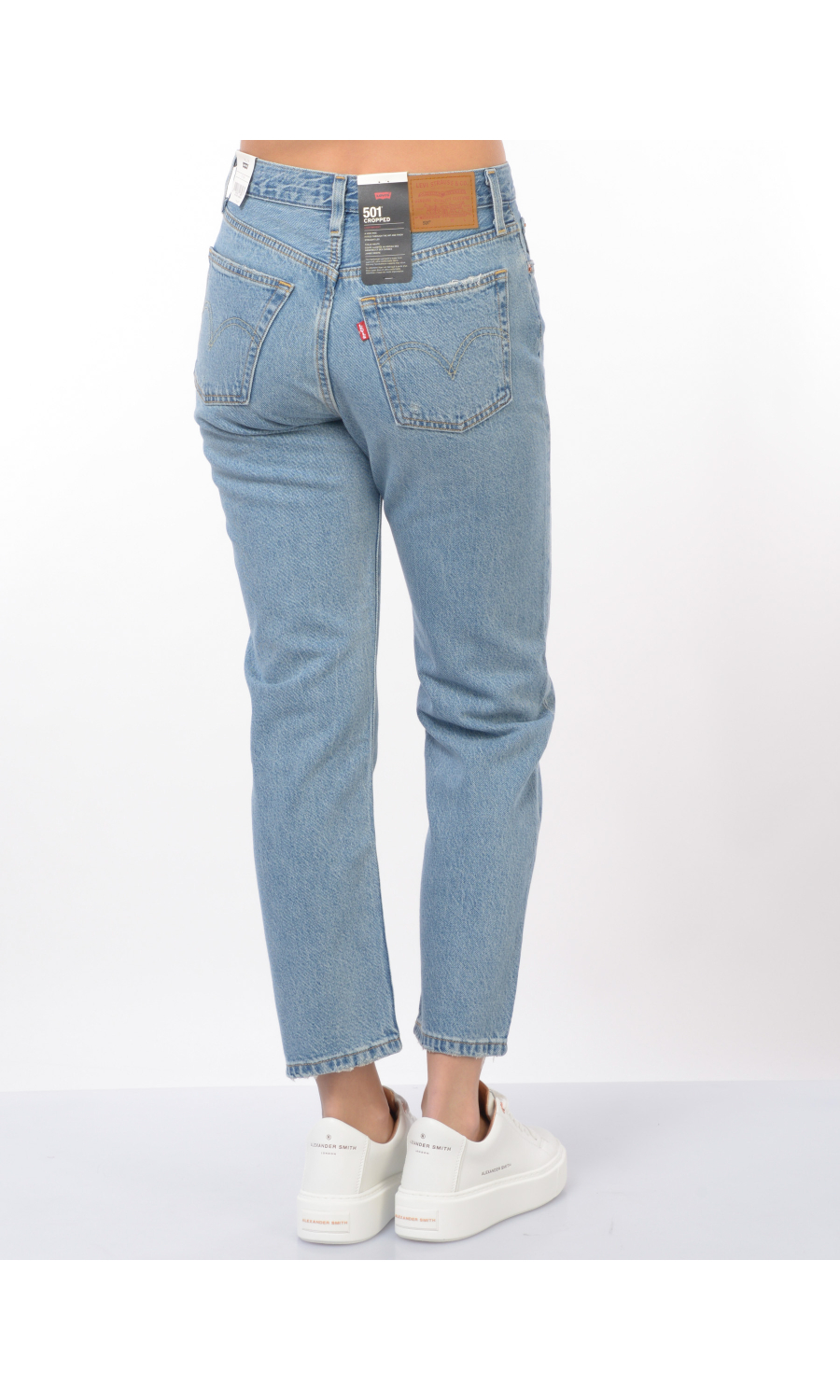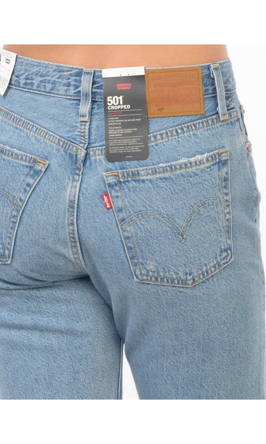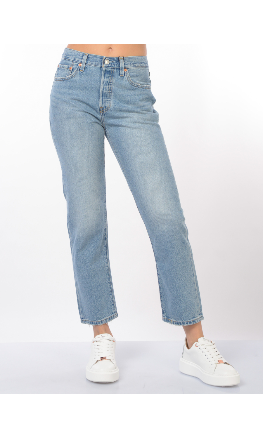 Jeans modello 501 Cropped con effetto delave' e used, chiusura frontale con bottoni logati in metallo di cui il primo a vista, fascetta in vita con passanti e salpa posteriore logata a contrasto colore, cinque tasche, rivetti logati in metallo applicati, motivo di impunture a contrasto colore, piccolo logo in tessuto a contrasto colore applicato sul retro, in cotone e lyocell.