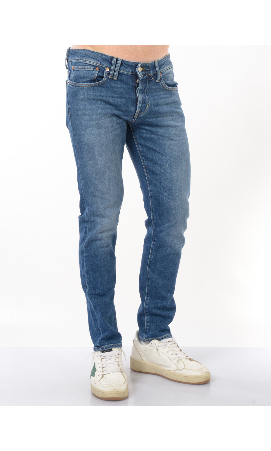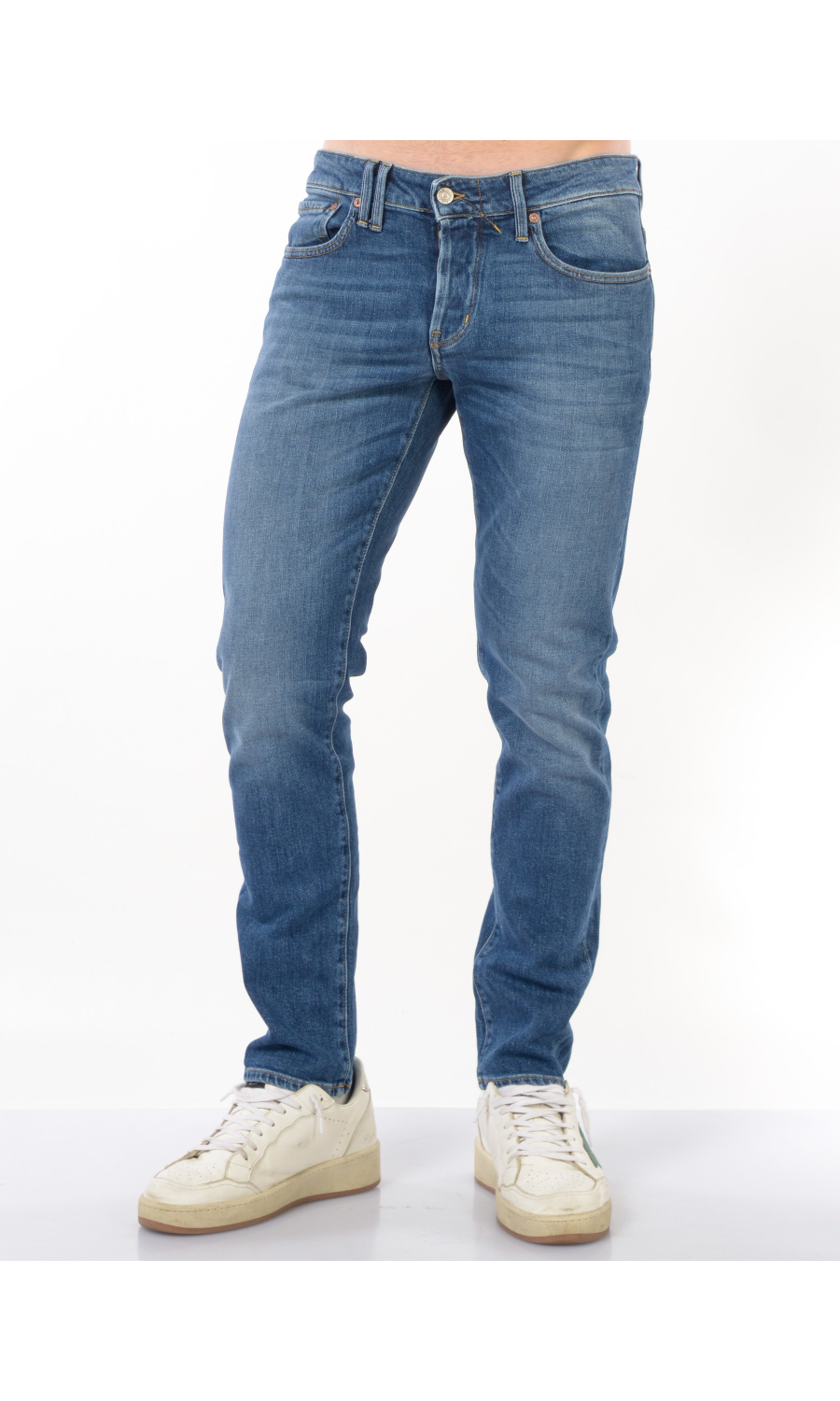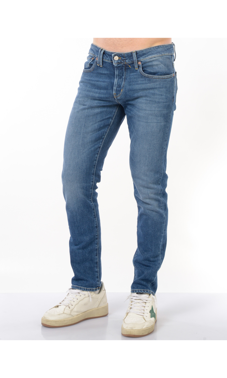 Jeans modello Bone Comfort Skinny cinque tasche, chiusura frontale con bottoni logati in metallo di cui il primo a vista, fascetta in vita con passanti e salpa posteriore logata a contrasto colore, rivetti logati applicati, motivo di impunture a contrasto colore, logo in metallo applicato sul retro, effetto stone washed, leggermente stretch.
