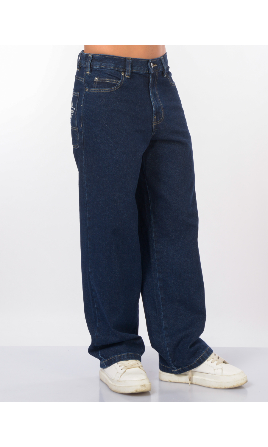 Jeans cinque tasche con maxi logo ricamato su tasca posteriore in contrasto colore, modello hilham con vestibilita over, , chiusura frontale con bottone logato e zip nascosta, fascetta in vita con passanti, cuciture in contrasto colore.