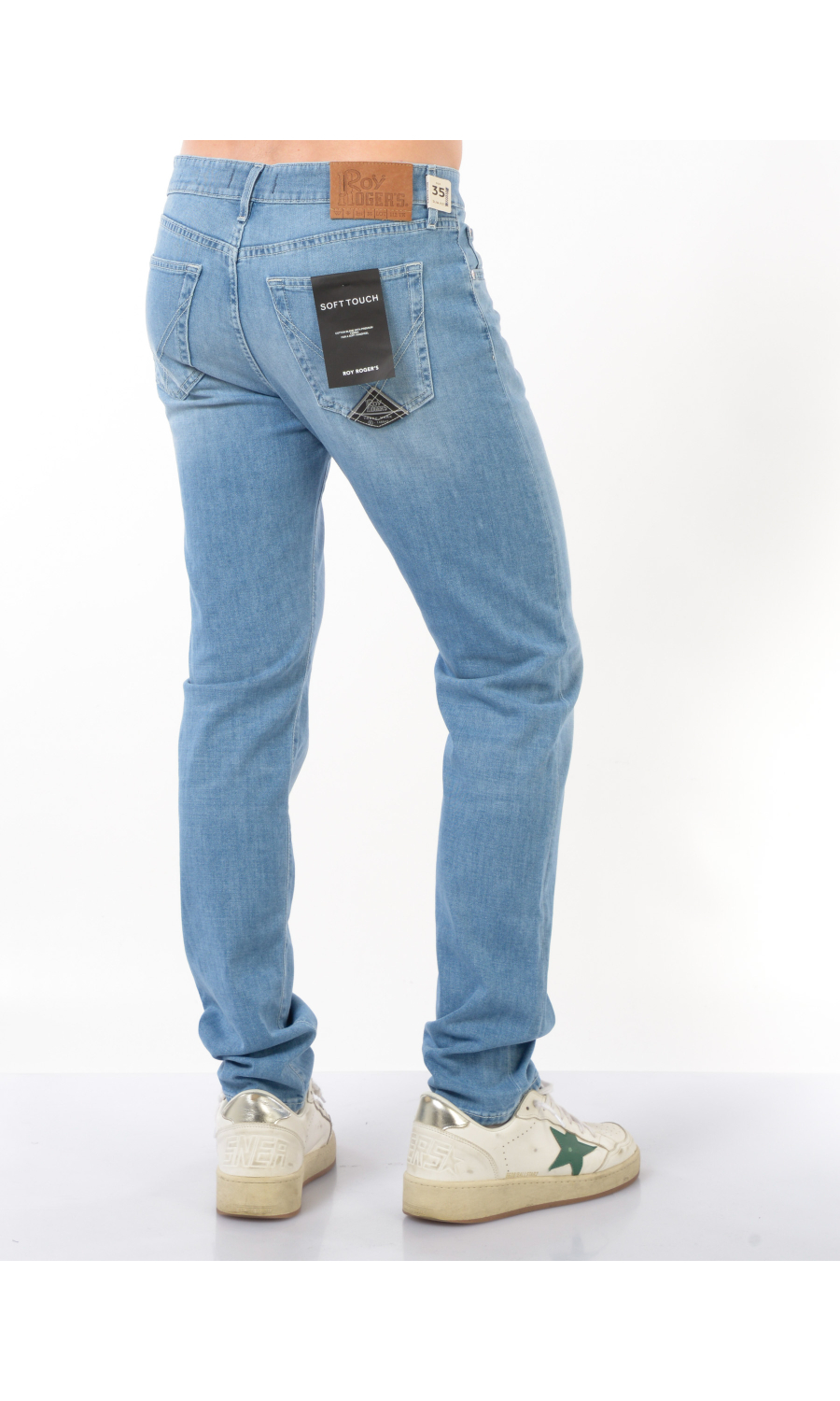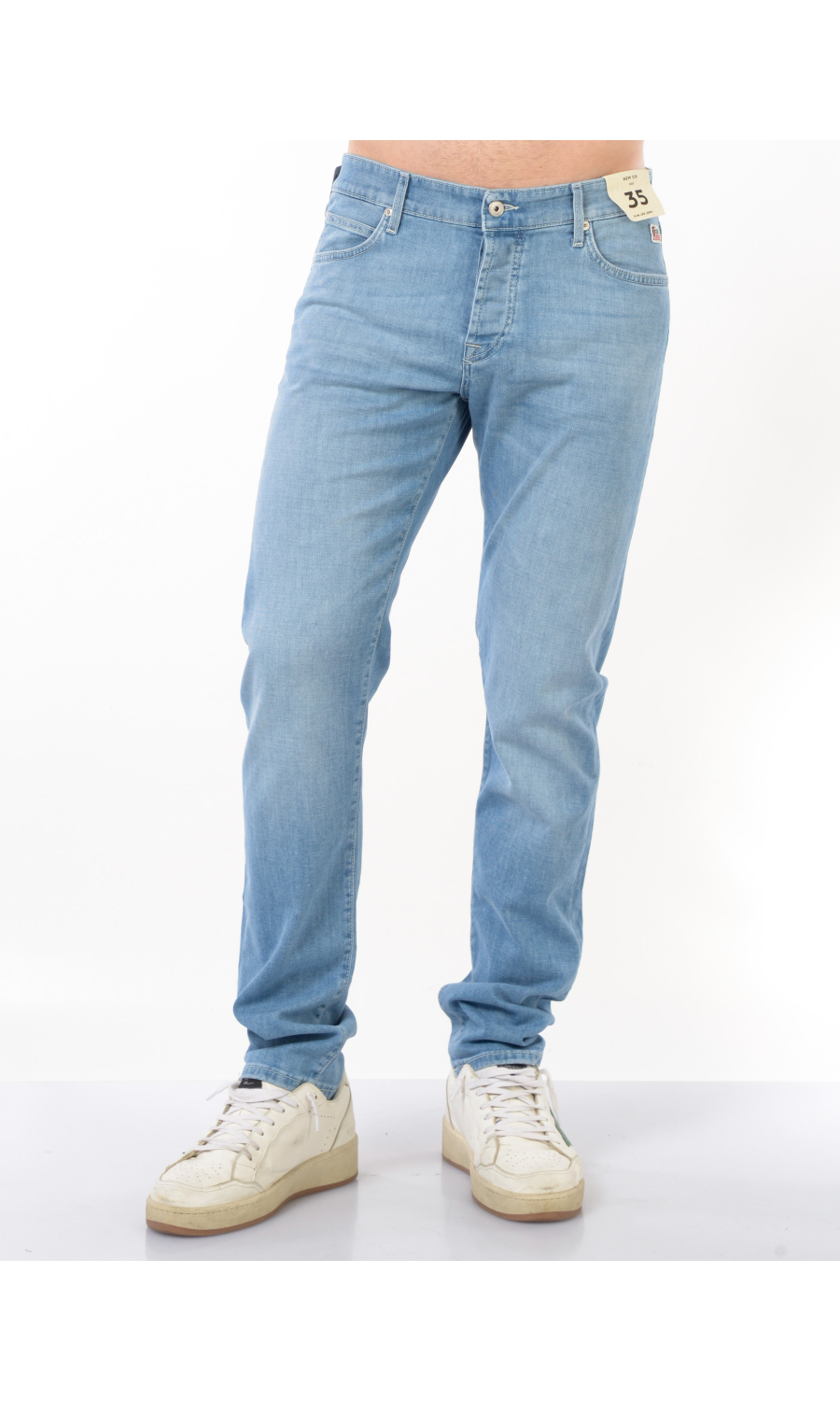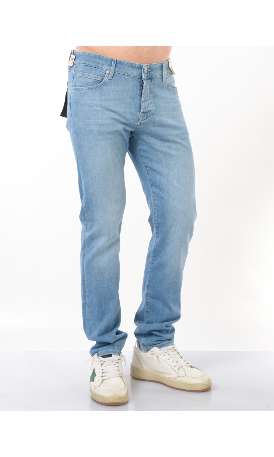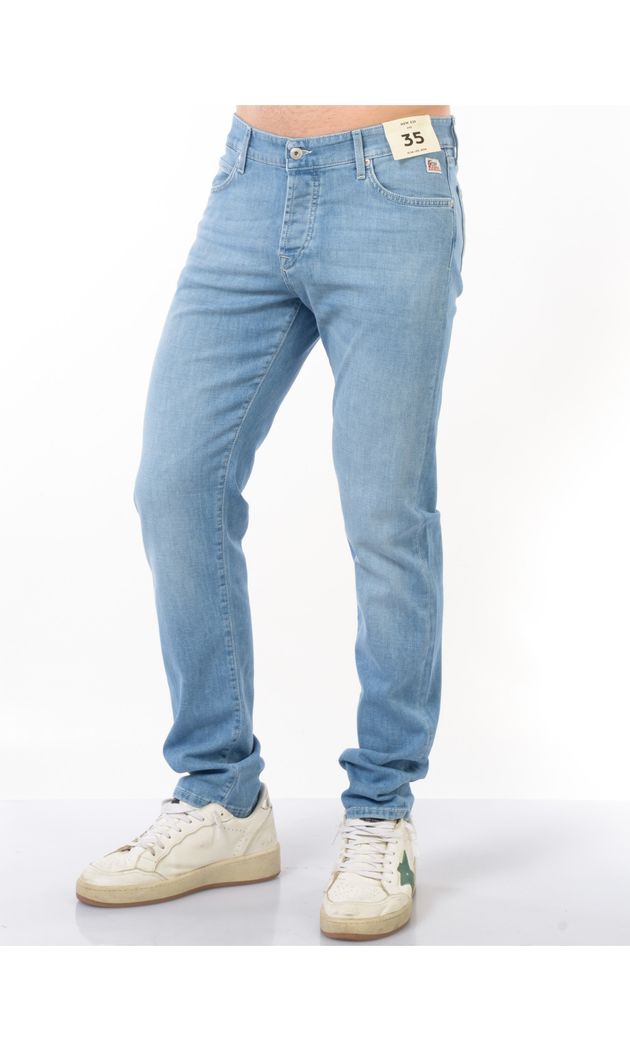 Jeans modello New 529 Slim Leg Jean con effetto delave', chiusura frontale con bottoni logati di cui il primo a vista, fascetta in vita con passanti e salpa posteriore logata effetto camoscio a contrasto colore, cinque tasche, rivetti logati in metallo applicati, logo applicato frontale e posteriore, stretch.