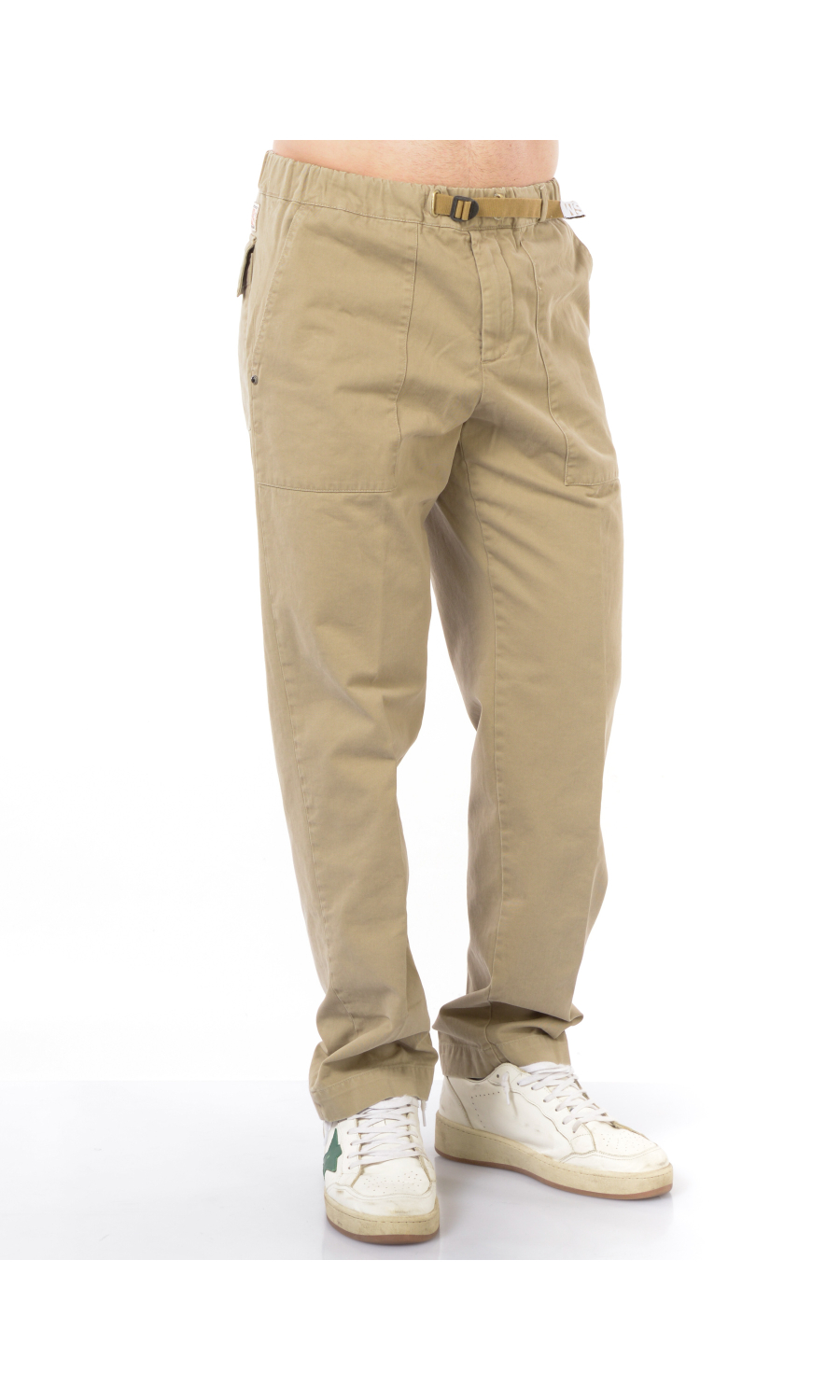 Pantalone modello cargo con elastico e coulisse regolabile su fascetta in vita, zip frontale nascosta, due maxi tasche oblique a toppa frontali e due a toppa posteriori chiuse con pattina e bottone nascosto, rivetto gioiello applicato frontale, piega stirata.