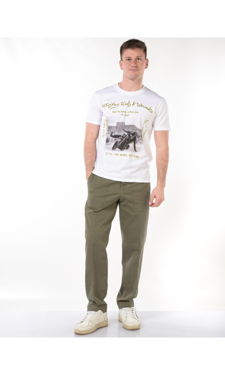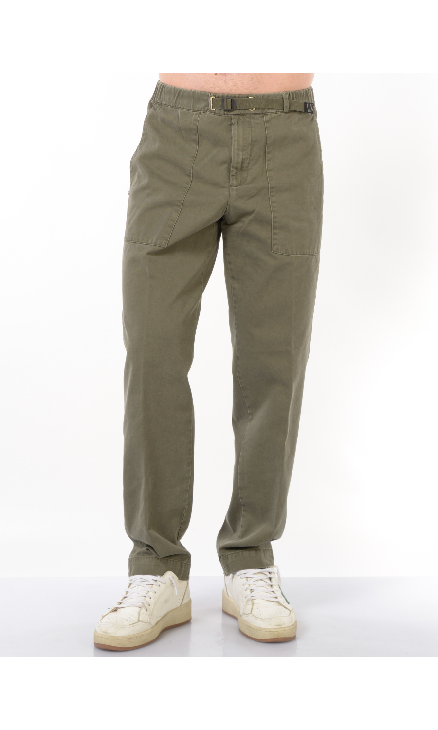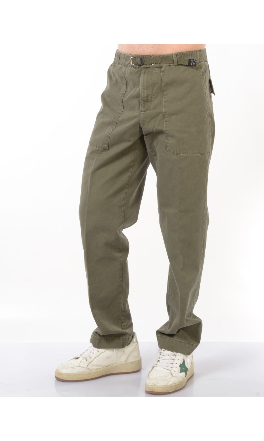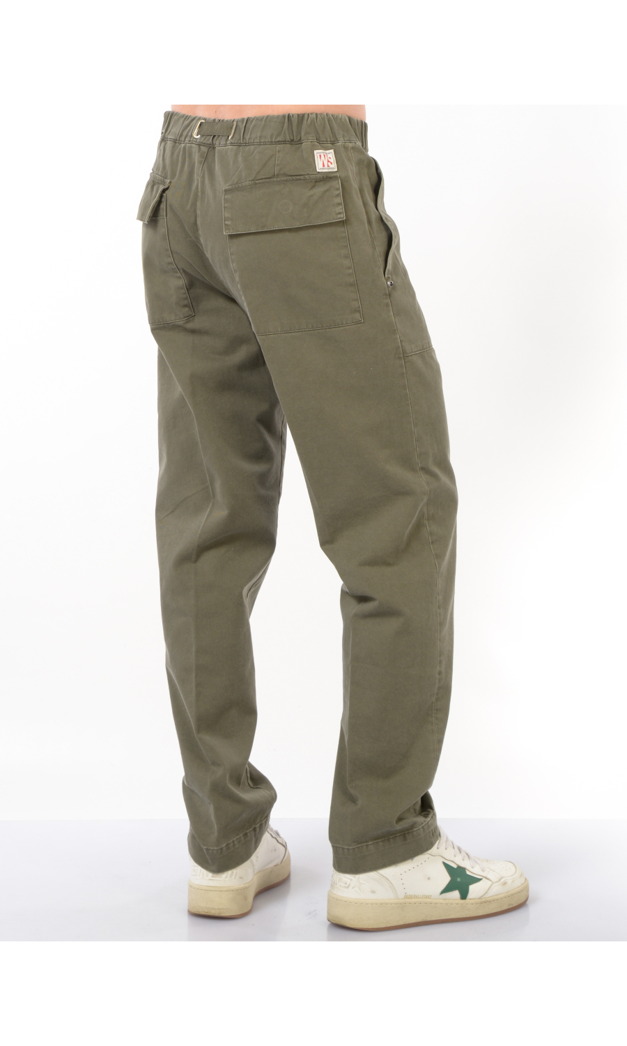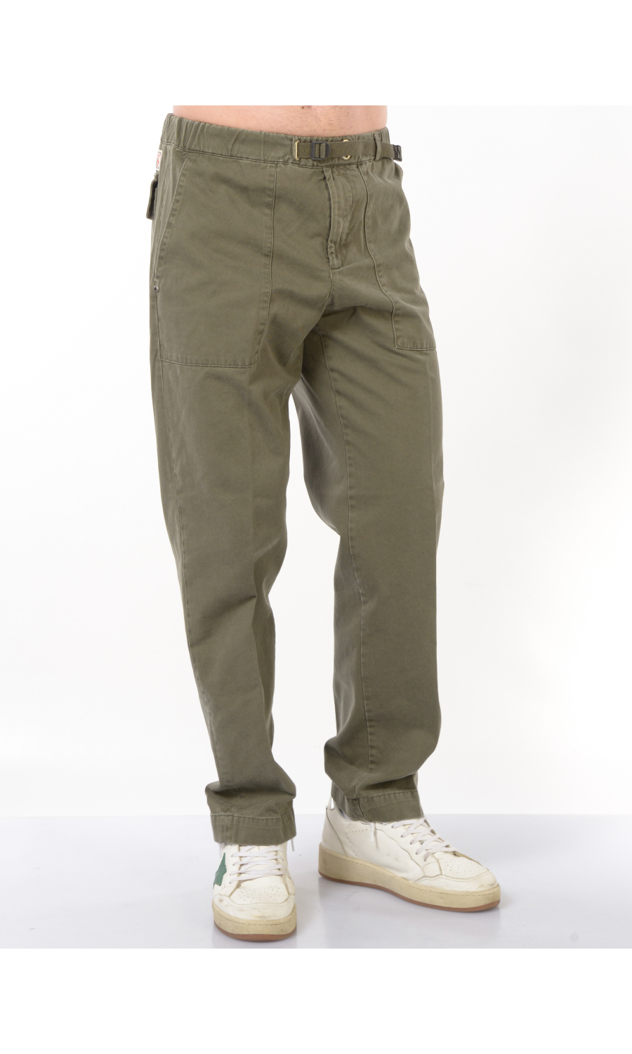 Pantalone modello cargo con elastico e coulisse regolabile su fascetta in vita, zip frontale nascosta, due maxi tasche oblique a toppa frontali e due a toppa posteriori chiuse con pattina e bottone nascosto, rivetto gioiello applicato frontale, piega stirata.