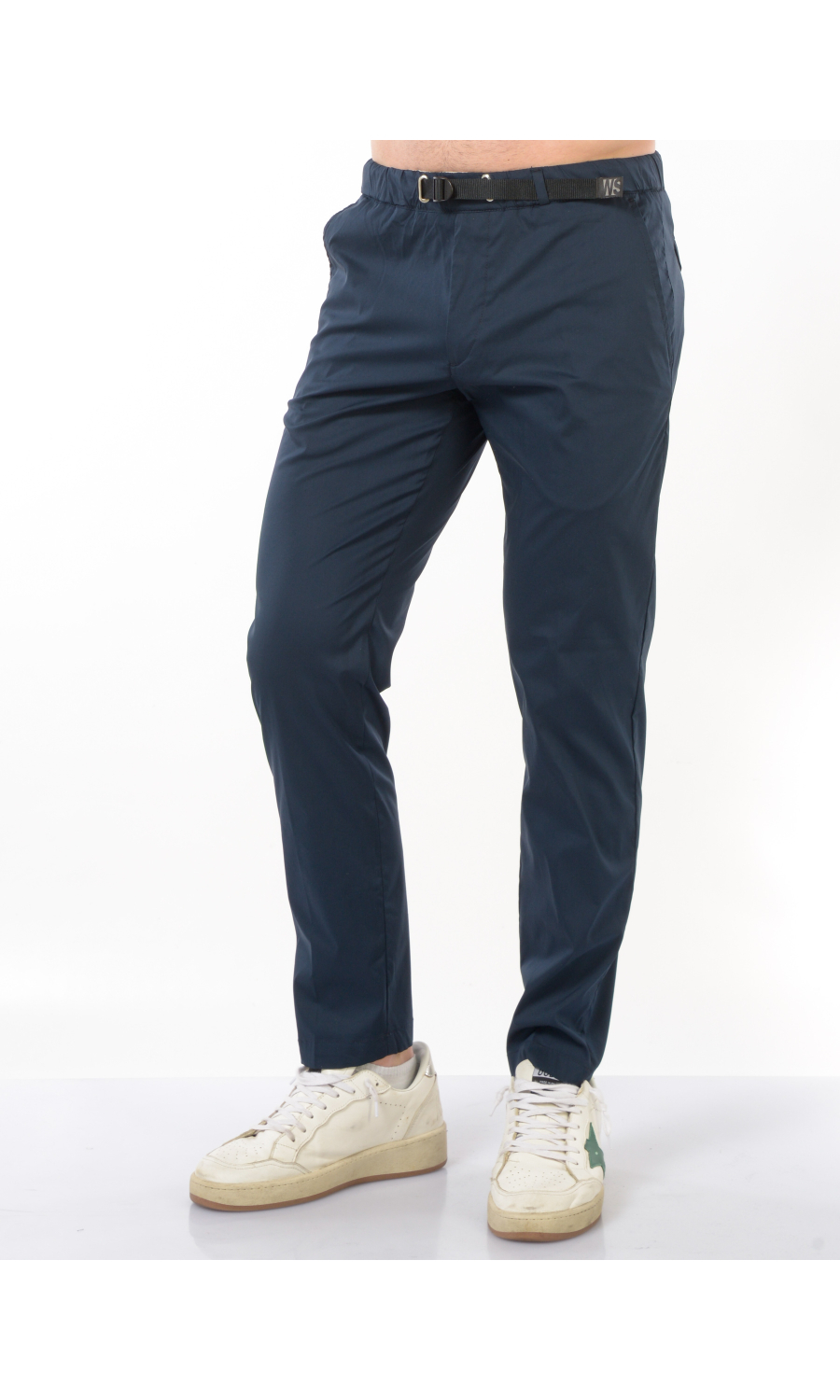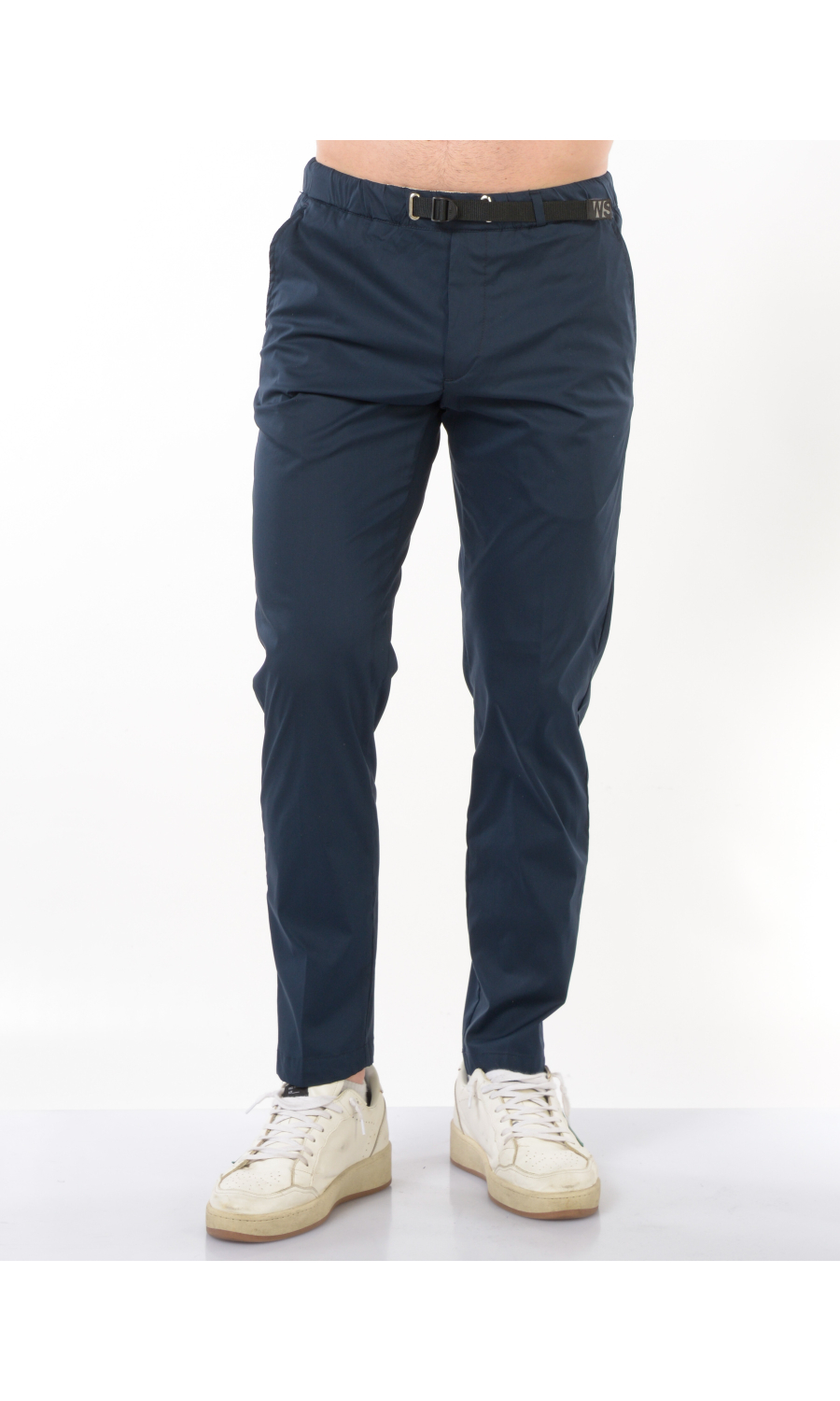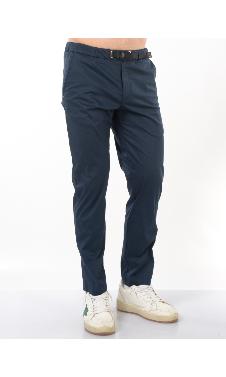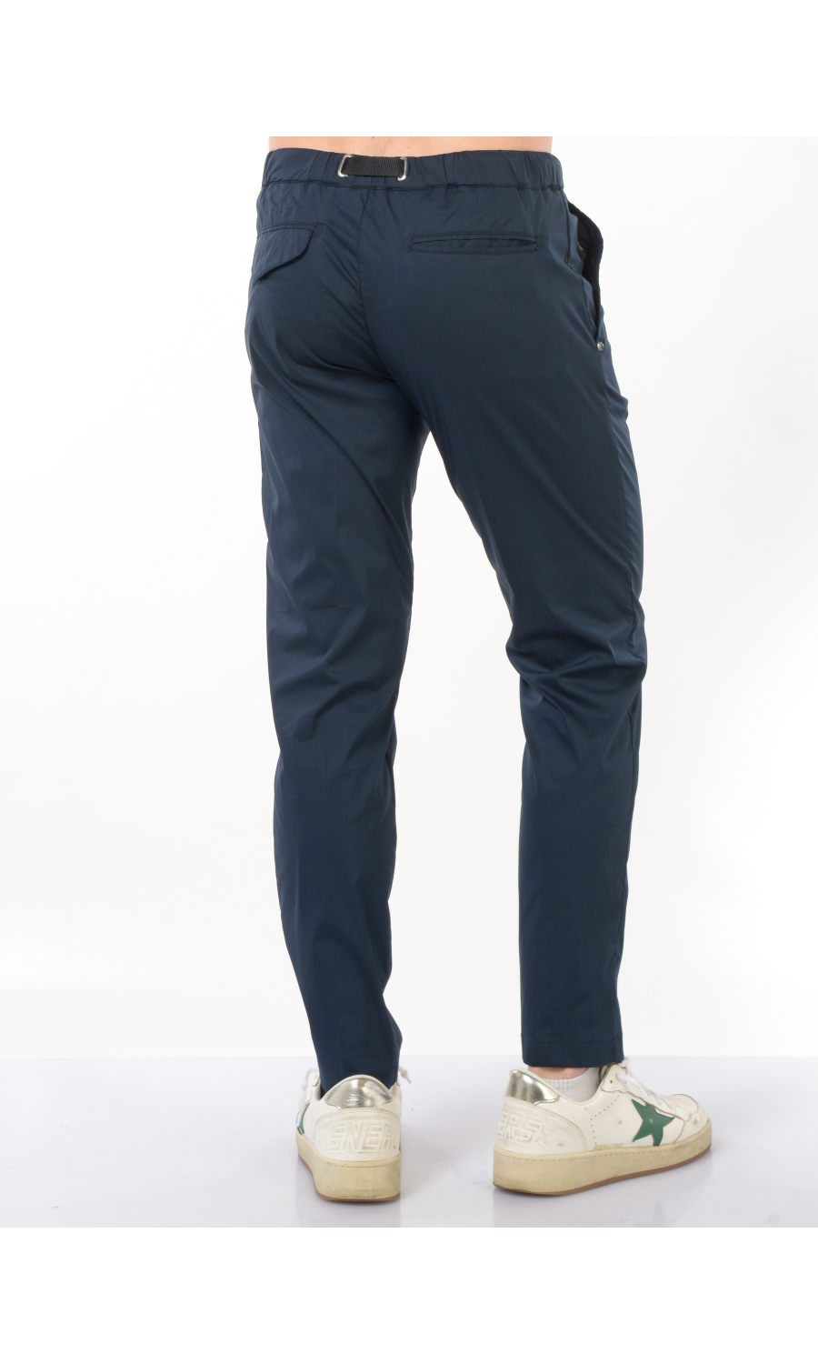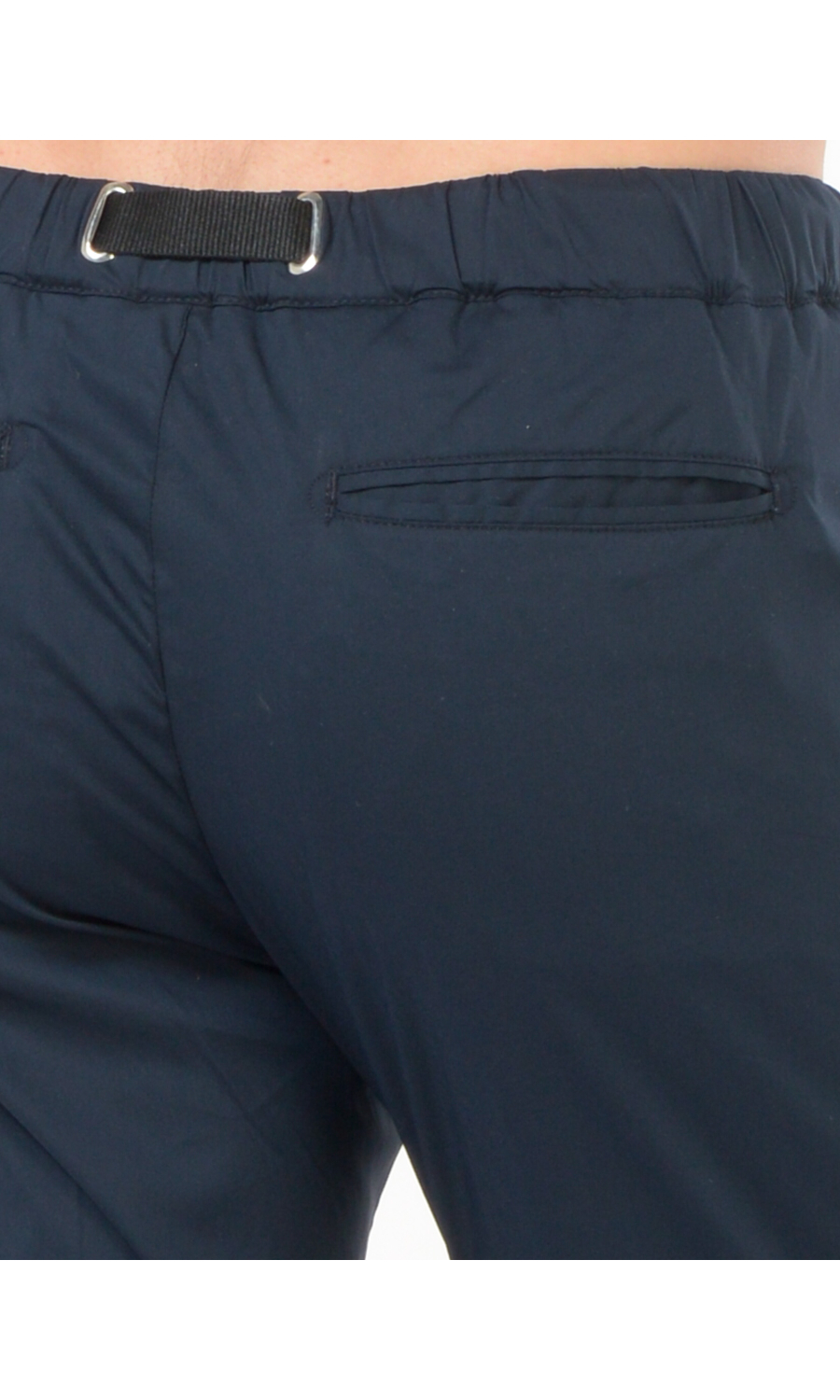 Pantalone modello chino in cotone tecnico stretch, elastico e coulisse regolabile su fascetta in vita, zip frontale nascosta, due tasche oblique frontali e due a filetto posteriori di cui una chiusa con pattina e bottone a pressione nascosto, rivetto gioiello applicato frontale, piega stirata.