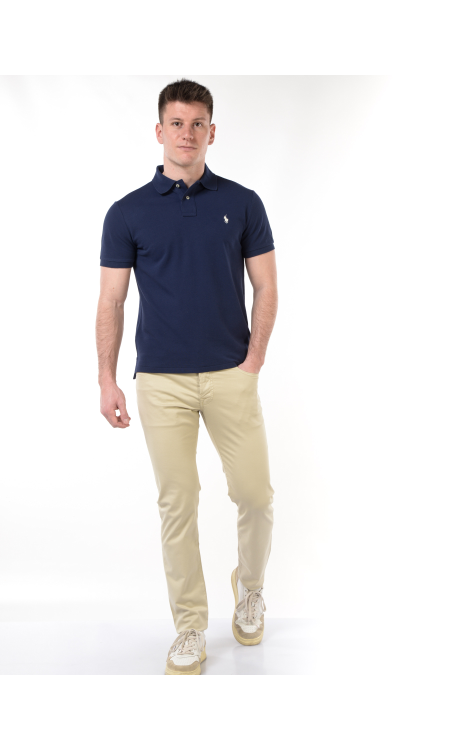 Polo modello Custom Slim Fit con logo ricamato frontale a contrasto colore, chiusura frontale con bottoni a vista a contrasto colore, manica corta con rovescino sul fondo, motivo di piccoli spacchi laterali sul fondo, in piquet di cotone.