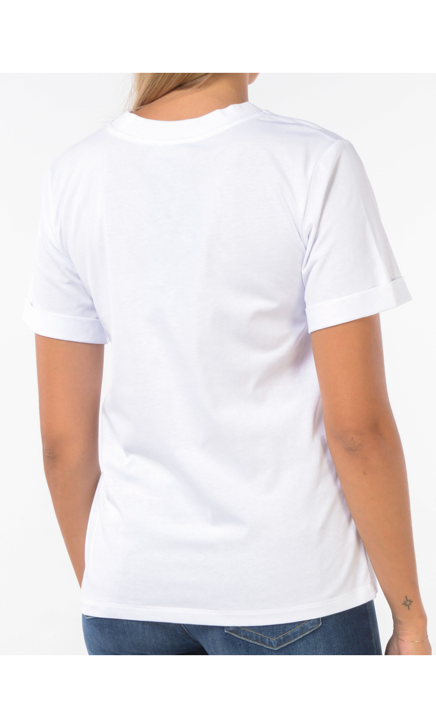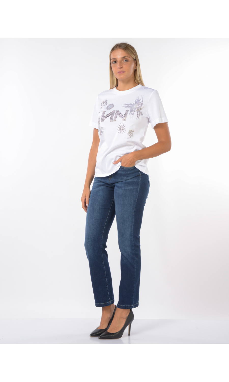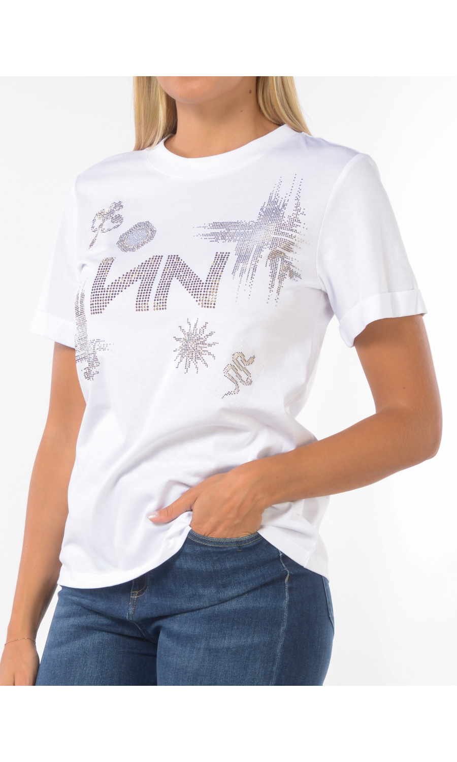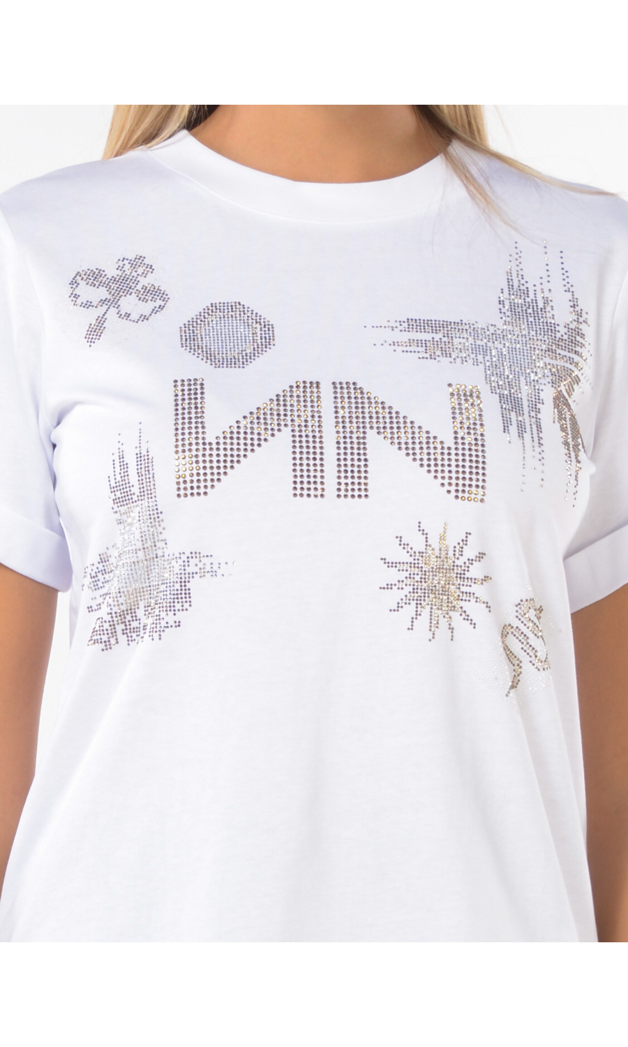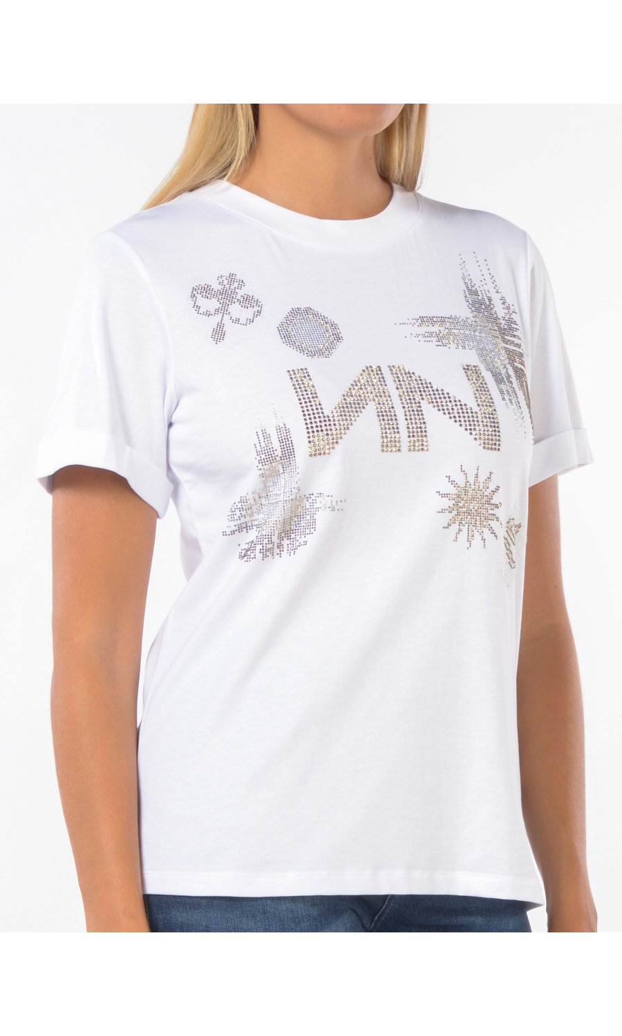 T Shirt con logo ed applicazioni frontali in strass, manica corta con piccolo risvolto.